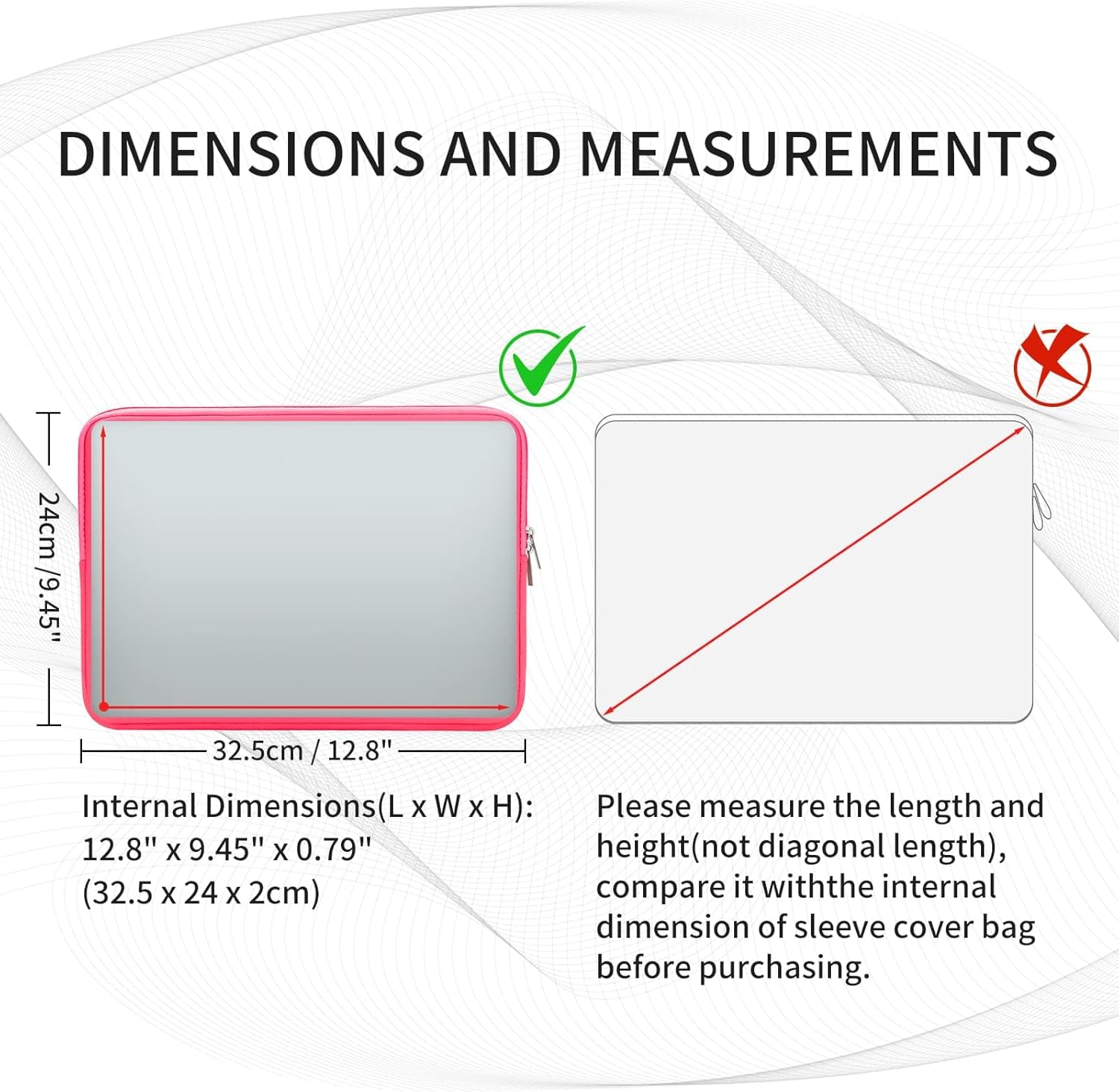 - NOTICE: The [13"-13.3"] size compatible with 14" MacBook Pro M1 M2 M3 M4 Pro/Max A2779 A2918 A2992 A3112 A3401 A3185 A2442 and most 13.3" MacBook/Laptop/Tablet/Notebook/Chromebook, Internal Dimensions(L x W x H): 12.80" x 9.45" x 0.79". If you especially need a snug fit or a loose fit, please compare the actual dimensions of your laptop with the internal dimensions of the sleeve, and make sure those are smaller than the internal dimensions, the more similar, the more fit.
