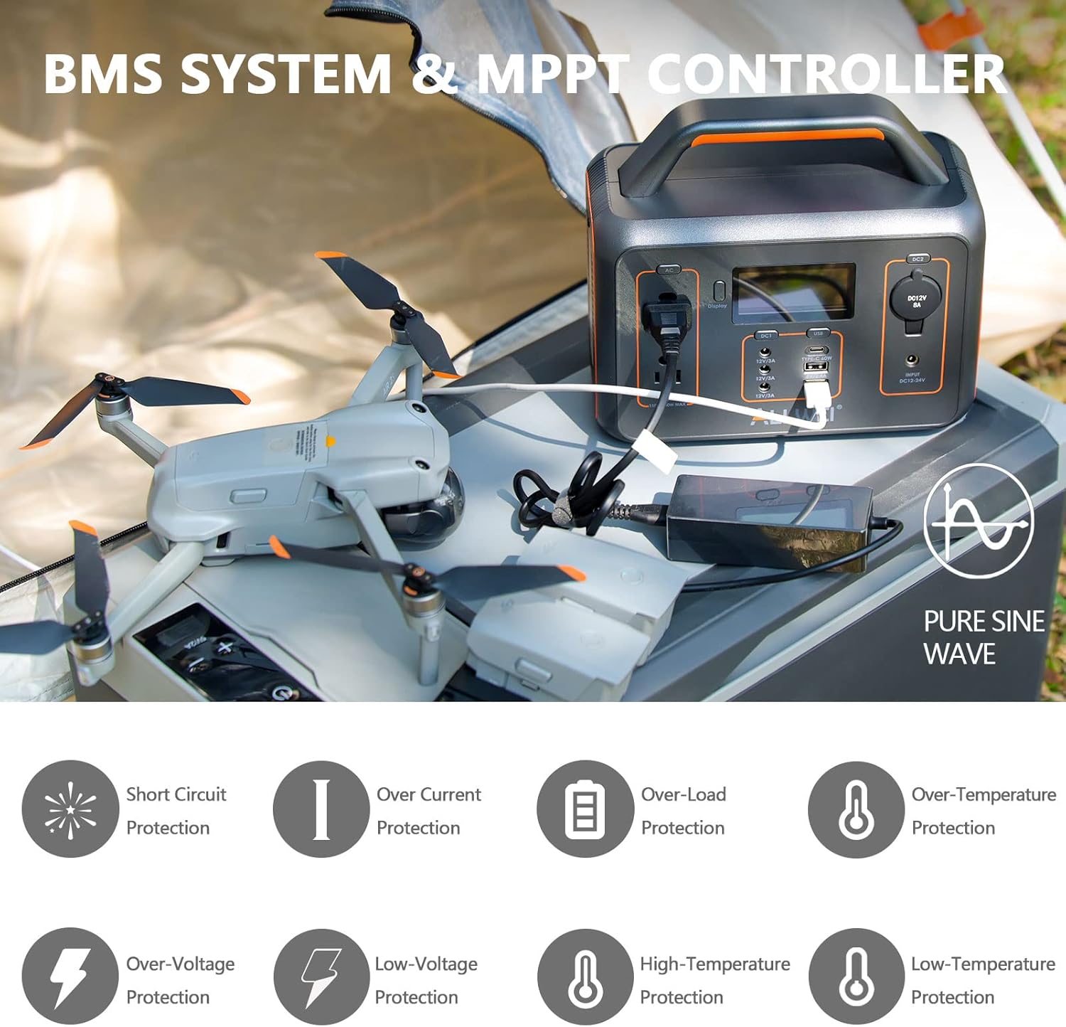 - 【BMS System】The generator adopt premium lithium ion batteries to ensure you and your devices safety while use. Support 1500 life cycle. The BMS and MPPT Controller is built in multiple protections via LCD screen icon flash.