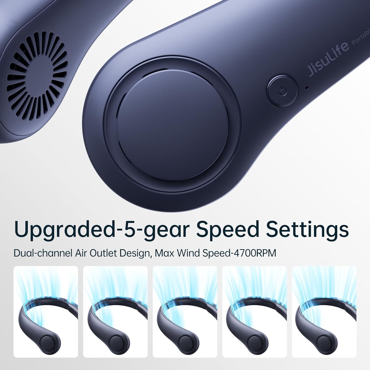 JISULIFE Portable Neck Fan, Hands Free Bladeless Fan, 5 Speeds, 4000 mAh Battery Operated Wearable Personal Fan, Twistable, Rechargeable, Gift for Women Men-Blue