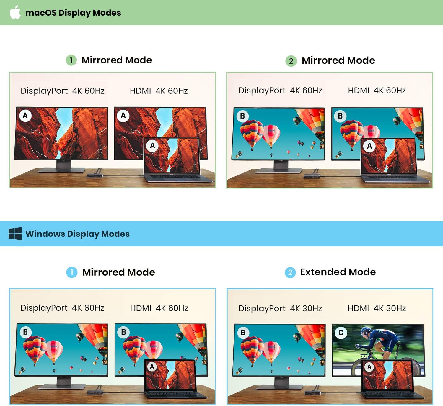 - [FULL 4K 60Hz] Single display up to 4K 60Hz, Dual 4K 60Hz Mirrored (Mac & Windows), or Dual 4K 30Hz Extended (Windows only). **Thunderbolt 3/4 or USB-C port that supports DP 1.4 required for full 4K 60Hz output. Please check product manual or our website to verify which display configuration is supported by your system.