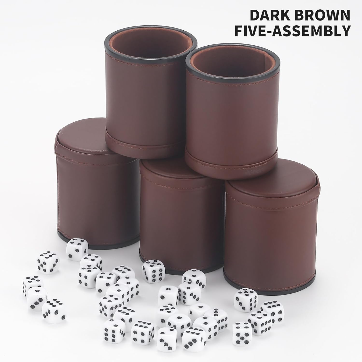 5 Pack PU Leather Dice Cups Velvet Felt-Lined Shaker Cups with 25 Dot Dice for Bar Party Yahtzee Farkle Dice Games, Brown