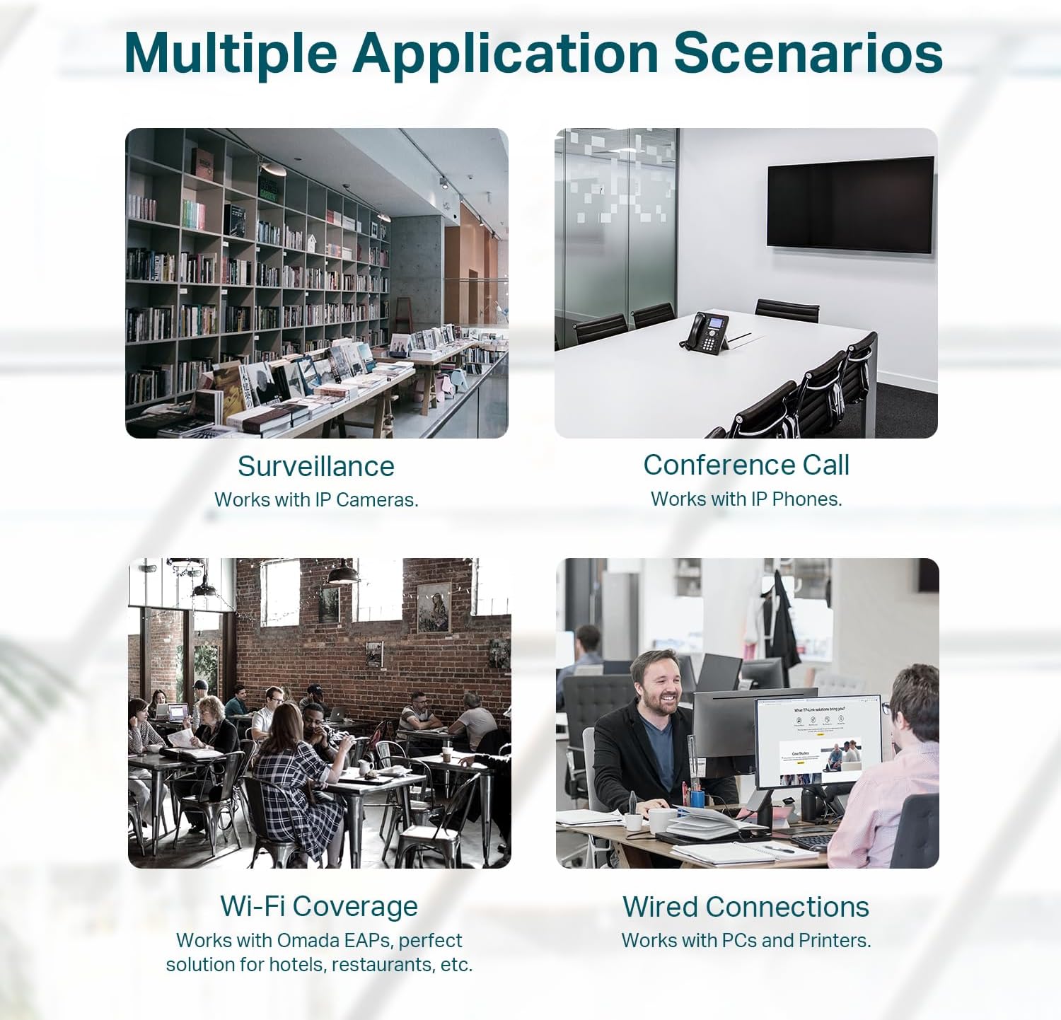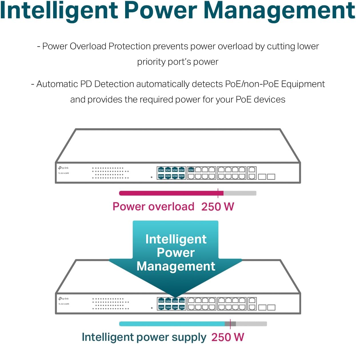 - 𝐅𝐥𝐞𝐱𝐢𝐛𝐥𝐞 𝐅𝐮𝐥𝐥 𝐆𝐢𝐠𝐚𝐛𝐢𝐭 𝟐𝟖-𝐏𝐨𝐫𝐭 𝐏𝐨𝐄 𝐂𝐨𝐧𝐟𝐢𝐠𝐮𝐫𝐚𝐭𝐢𝐨𝐧: 24 x PoE+ (802.3at/af) 10/100/1000 Mbps RJ45 ports providing up to 30W per port and total PoE power budget of 250W, together w/ 2x Gigabit Non-PoE Ports and 2 SFP Slot for high-speed connections.