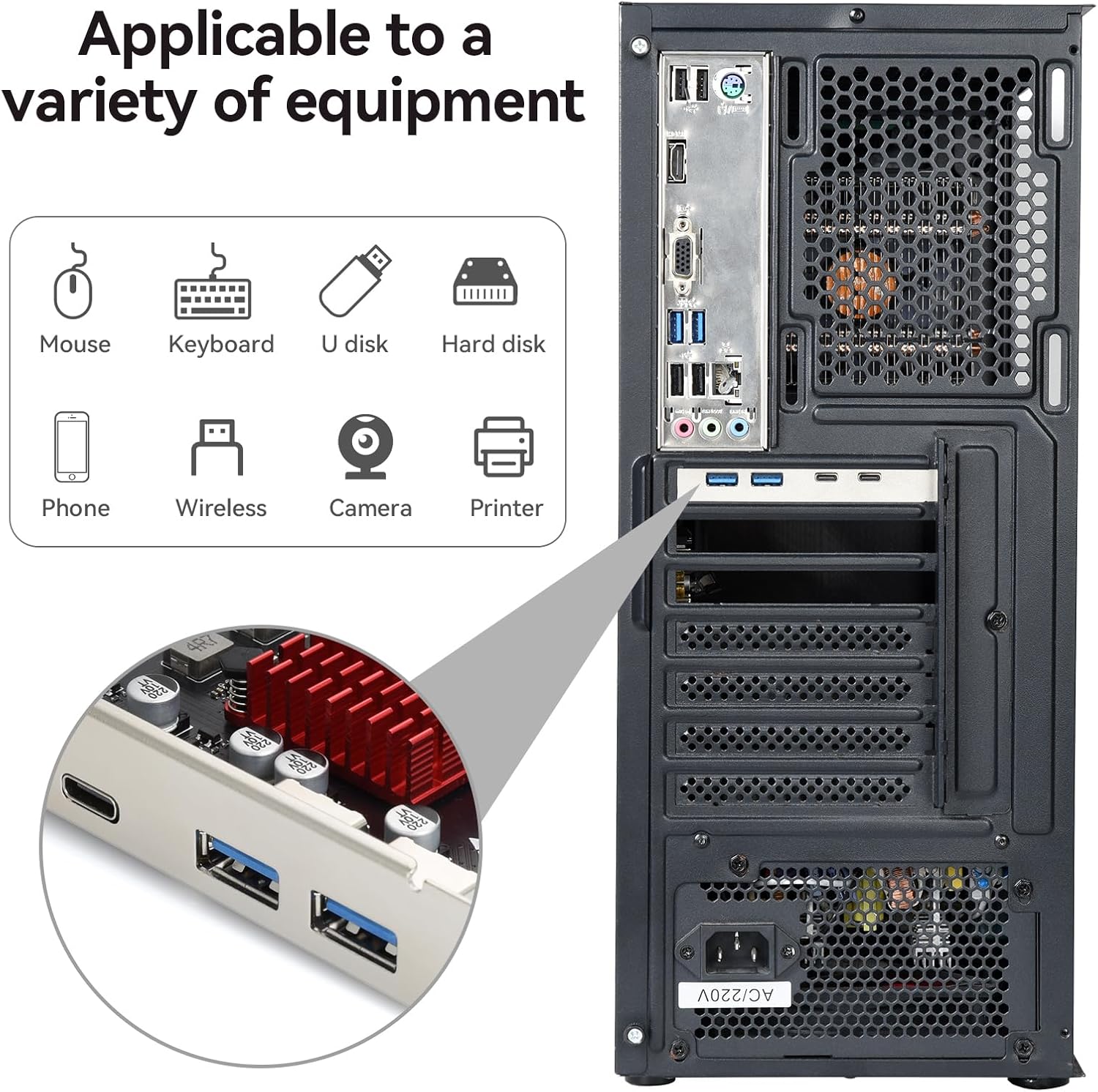 - 【Widely Compatible】The USB C card is compatible with PCIE X1, X4, X8, X16 slots. NOT applicable to PCIE X2 and PCI slots. Support Windows 11/10/8/7/XP/Vista, plug and play, no driver installation required. *Note: Windows 7/XP/Vista needs to install additional drivers. Windows 8/10/11 does not need drivers.