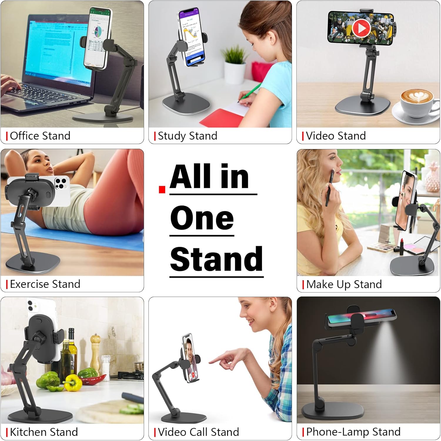 APPS2Car Phone Stand for Desk [No Dropping Stable Triple-Clamp Holder] Adjustable Height 360 Degree Rotation Heavy Base Thick Case Friendly, Multifunctional Cell Phones Stand for iPhone Android Phones
