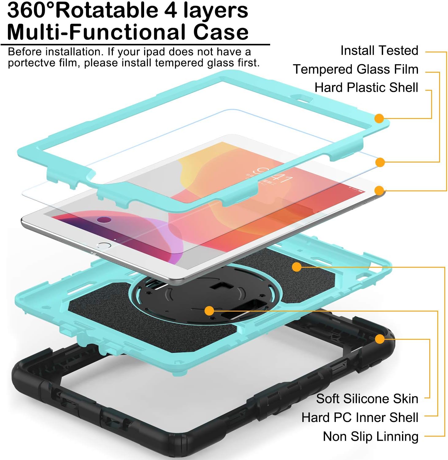 - Removable Shoulder Strap: Attach the strap to any two corner holes of this iPad 10.2 Case and it will allow you to display your iPad behind car head rest for easy personal viewing or between two seats for shared viewing. It is also a unique design for kids walking/travelling, architecture designers, real estate agents, construction workers as well as outdoor labor