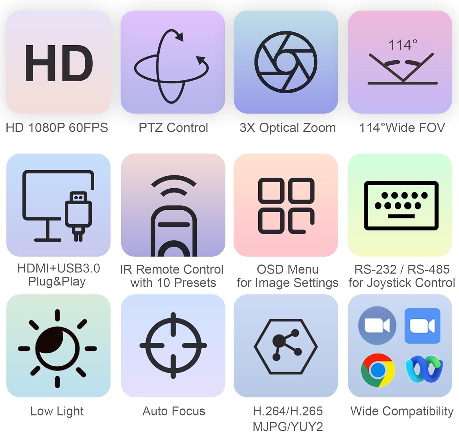 3X Optical Zoom PTZ Camera HDMI USB 3.0 1080P 60fps 114-Degree Wide-Angle for Video Conference Business Meeting Live Streaming Online Learn with Zoom YouTube Teams OBS and More