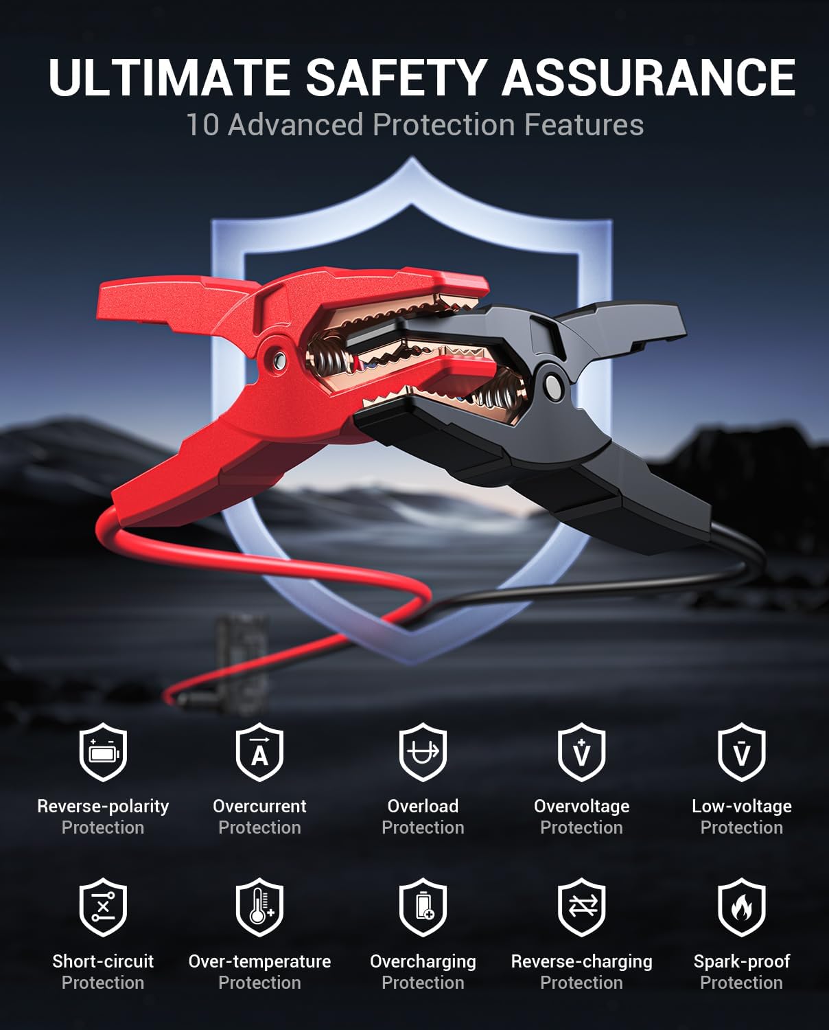- Smart Safety Protection - The battery jump starter works with intelligent jumper clamps which provide 8 safety protections to ensure it's safe to use. Also, the jumper clamps indicator light will notify you of any common incorrect operating.