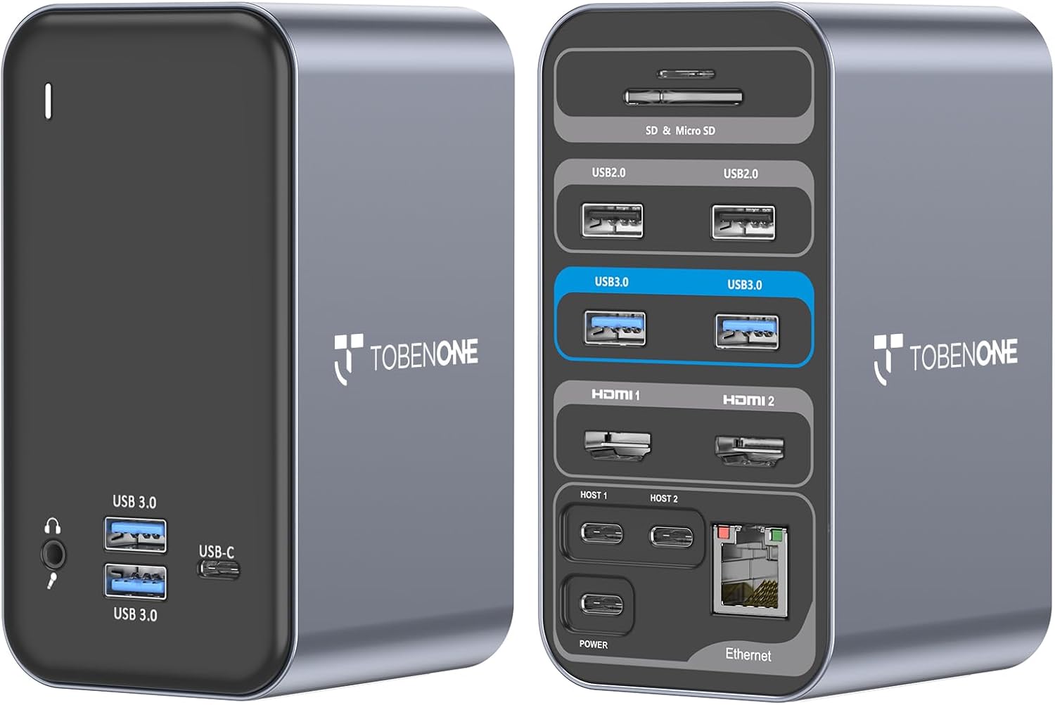 - Versatile Dual 4K Extend Monitor: TobenONE USB C dual monitor laptop docking station offers a choice to add 2 external monitors via HDMI ports, and easily drive two 4K@60Hz/4K@30Hz in extend mode, which means you can have 3 screens(included laptop) with different content at a time