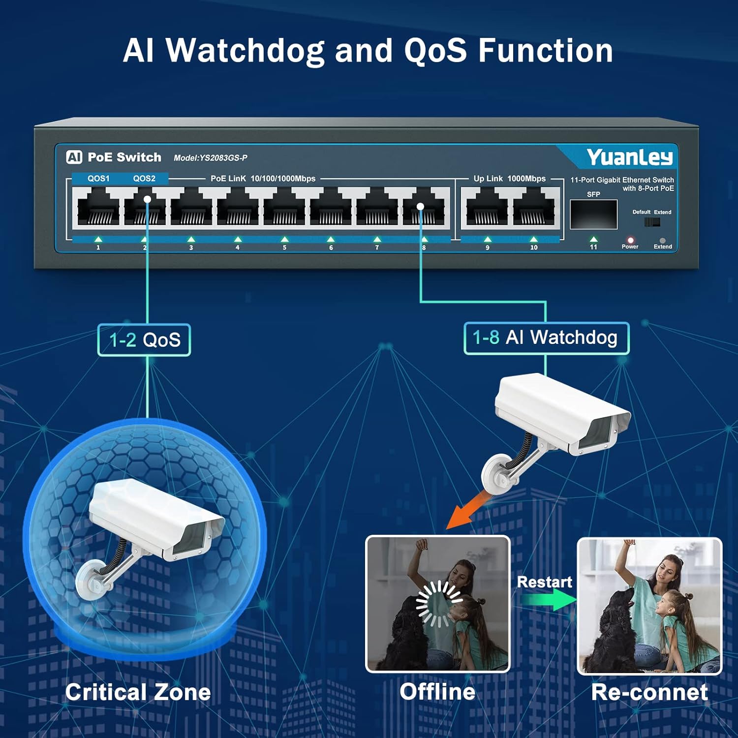- ✅【AI WatchDog, Qos】Support watchdog AI intelligent detection. When the POE device fails or crashes and goes offline, it will automatically restart the device to restore the link, make operation and maintenance more easier. Ports 1 and 2 support QoS, when a lot of network data causes congestion, the data of these 2 ports will be forwarded first, to ensure that the data of important devices will not be lost.