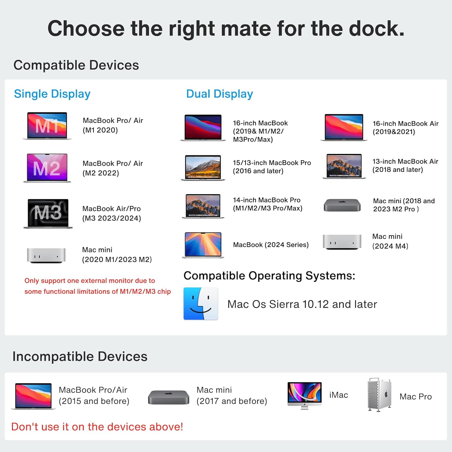 - 【Dual 4K@60Hz Displays】Only 15'' MacBook Pro (/2019/ 2018/ 2017), 16'' MacBook Pro (2019), MacBook Pro with M1/M2/M3 Pro/Max chips (2021/2023), MacBook 2024 M4 series and Macbook 2020 Intel series support dual 4K@60Hz. Other models can support dual 4K@60+30Hz