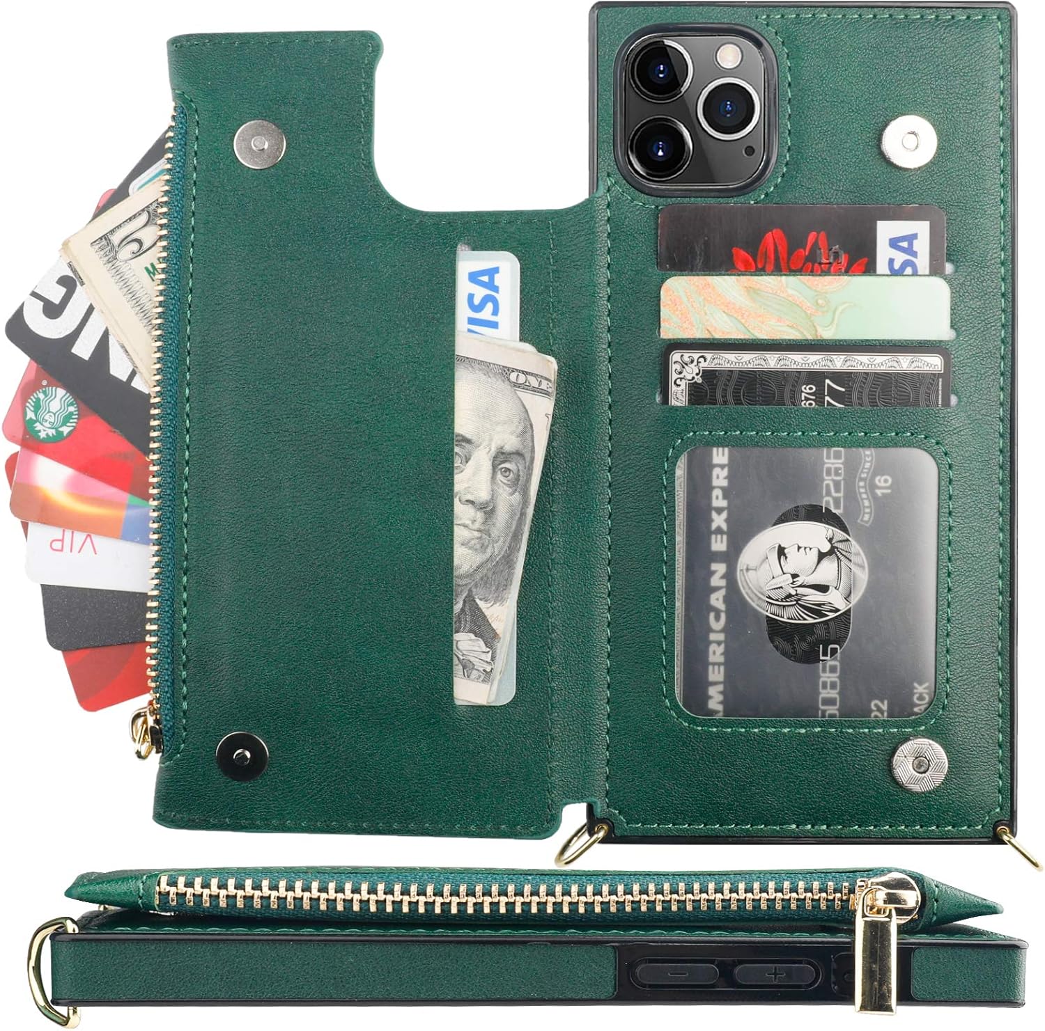 Bocasal Crossbody Wallet Case for iPhone 11 Pro Max with Card Holder,Zipper Card Slot Protector Shockproof Purse Cover with Removable Cross Body Strap 6.5 Inch(Green)