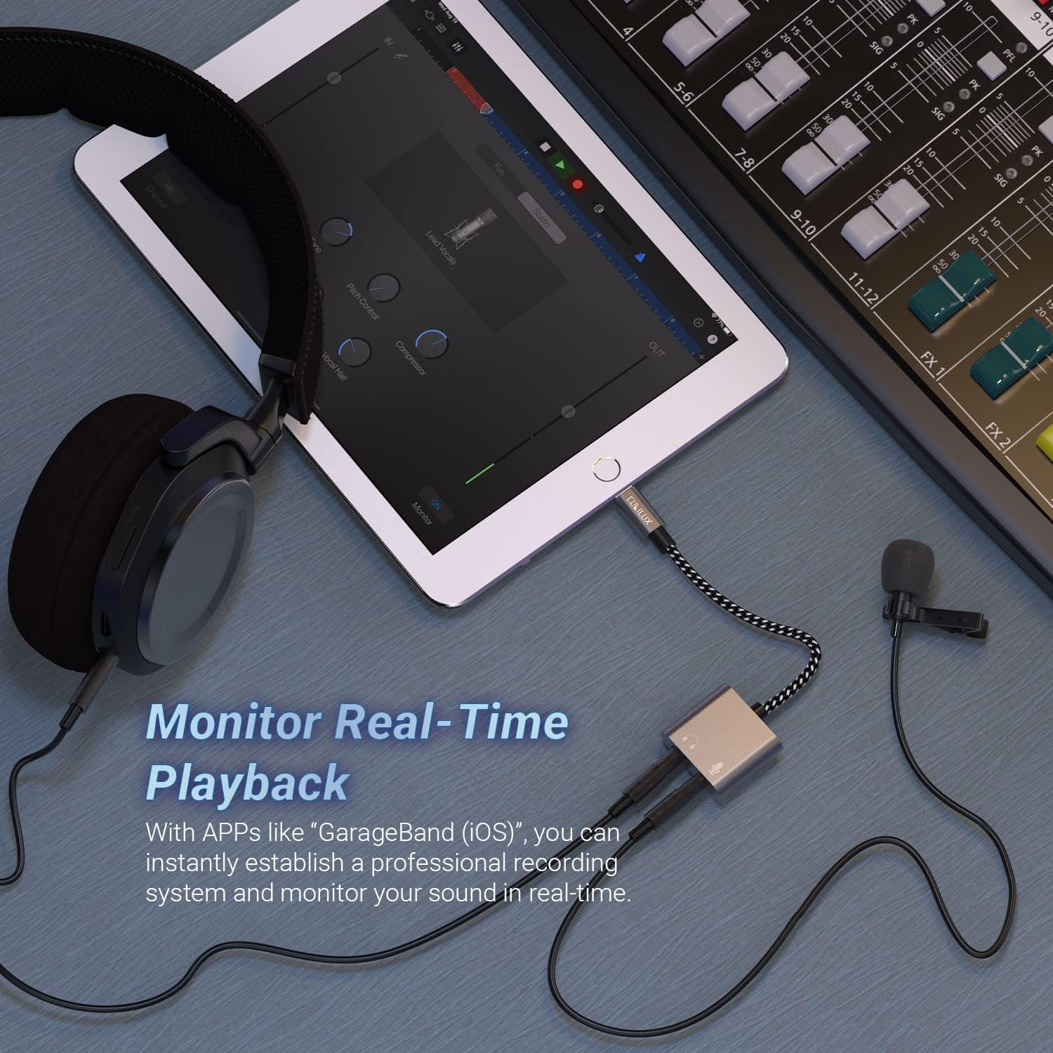 - [Lightning to Headphone & Microphone Adapter] – The adapter offers a 3.5mm microphone jack to connect lavalier MICs for recording and a 3.5mm audio jack to connect headphones for monitoring. The adapter is also suitable for connecting PC or gaming headsets with separated audio and microphone plugs to your iPhone or iPad.
