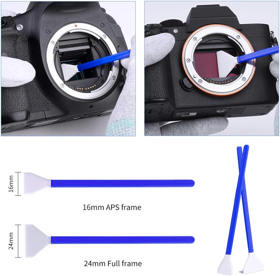 - [Professional Lens Cleaning Kit] : Dslr cleaning kit includes Lens Cleaning Pen + Camera Air Blower + Cleaning Liquid + 16mm APS-C Sensor Cleaning Swab*2 + 24mm APS Full Frame Sensor Cleaning Swab*8 + Large cleaning cloth*2 + Small vacuum cleaning cloth*6 + Anti-static gloves*1 + storage bag *1
