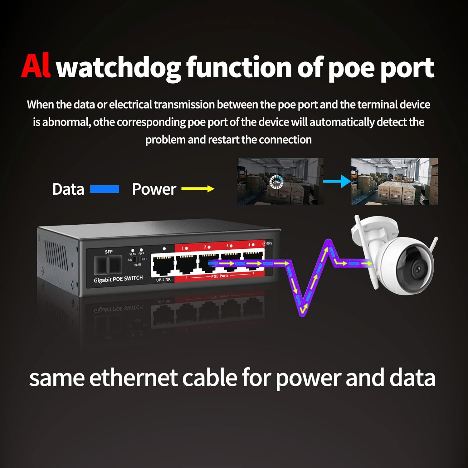 - 【AI Watchdog function of poe port】Turn on the VLAN switch,When the data or power transmission between the poe port and the terminal device is abnormal, the corresponding poe port of the device will automatically detect the problem and restart the connection.