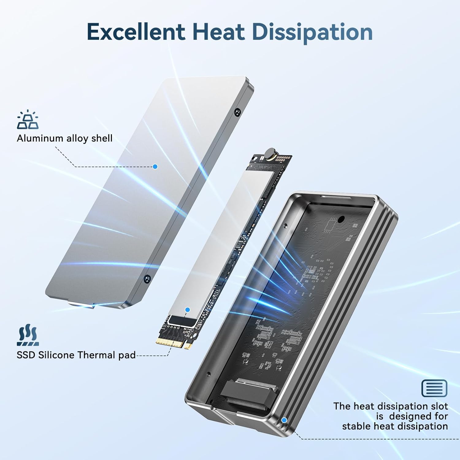 - 【Excellent heat dissipation】 The 40Gbps M.2 NVMe SSD enclosure comes with an aluminum alloy shell and 2 thermal pads (0.5mm + 1mm) for improved heat dissipation, maximizing performance and lifespan. Please select the thermal pad according to the thickness of the SSD to ensure that the SSD can touch the bottom plate.