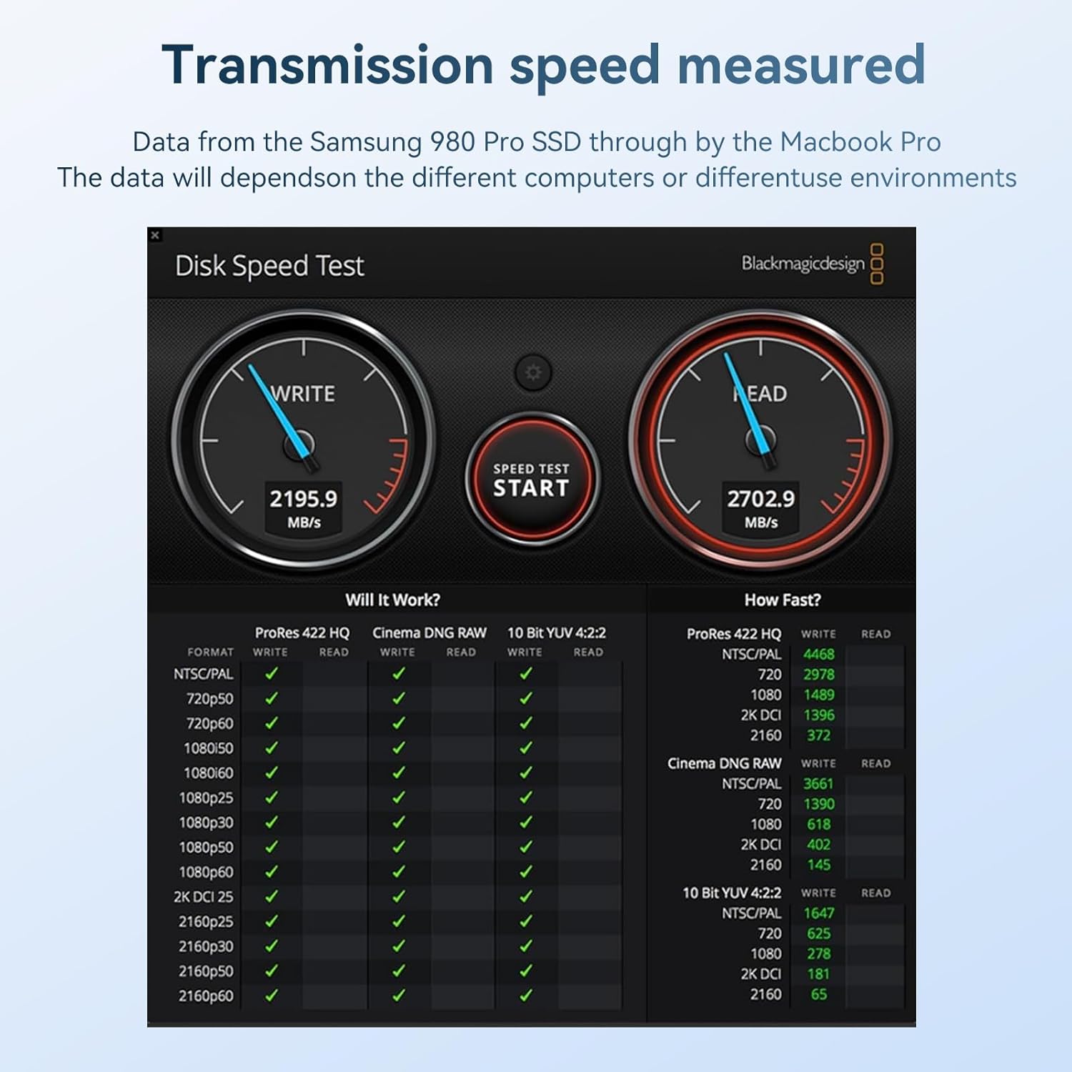 - 【40 Gbps lightning-fast transfer】 :Data from the Samsung 980 Pro SSD through by the Macbook pro The data will depends on the different computers or different use environments,This nvme enclosure 40gbps CompatibleThunderbolt 5/4/3 and backward compatible with USB3.2/3.1/.3.0/2.0 The ssd enclosure read and write speed can be up to 2700MB/s, which can help you transfer 2.5G files in seconds