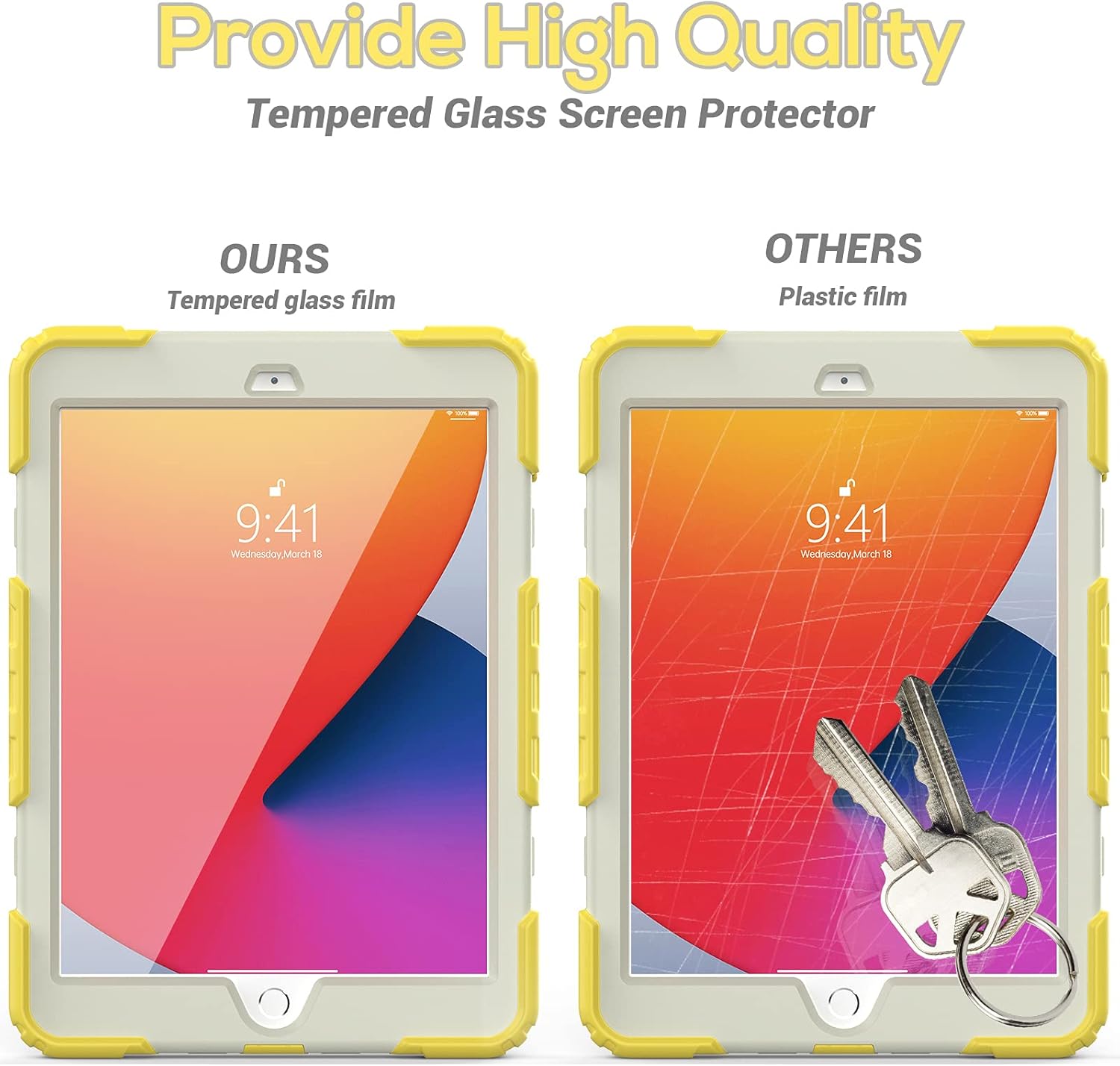 BLOSOMEET Kids Case for iPad 10.2 9th/8th Generation 2021 2020 with Tempered Glass Screen Protector Pen Holder,Cute Girls Boys iPad 7th Gen Cover Rugged w/Stand Hand Shoulder Strap Yellow