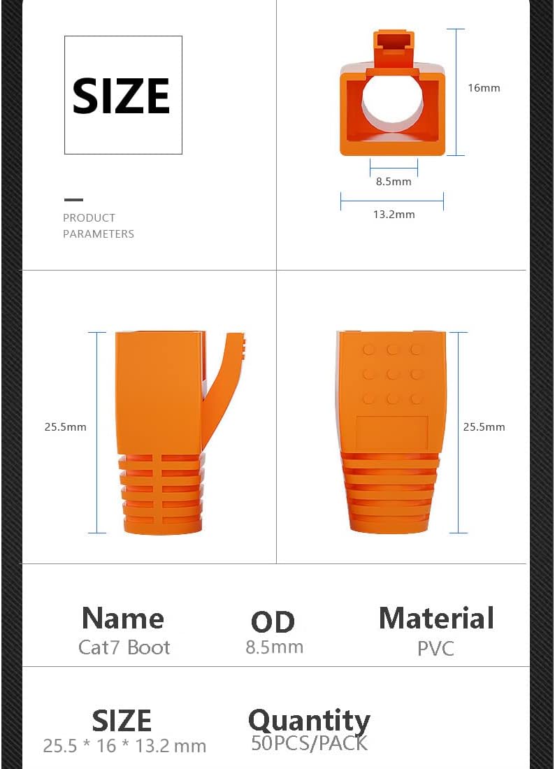 - Compatible with Cat7 Cat7A Cat8 cables and RJ45, 8P8C modular plug connectors, the Boots OD 8.5mm for lan cable OD 7~8mm (0.28~0.33inch).