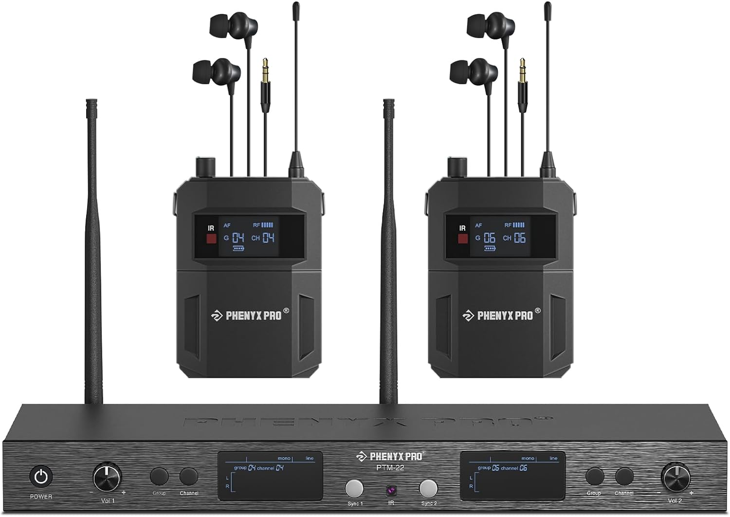 Phenyx Pro UHF Mono Dual Wireless in-Ear Monitor System, Metal Wireless IEM System, Sturdy Bodypack Receiver, 2x50 Frequencies, Separate Outputs,164ft Operation, Suitable for Band and Studio (PTM-22)