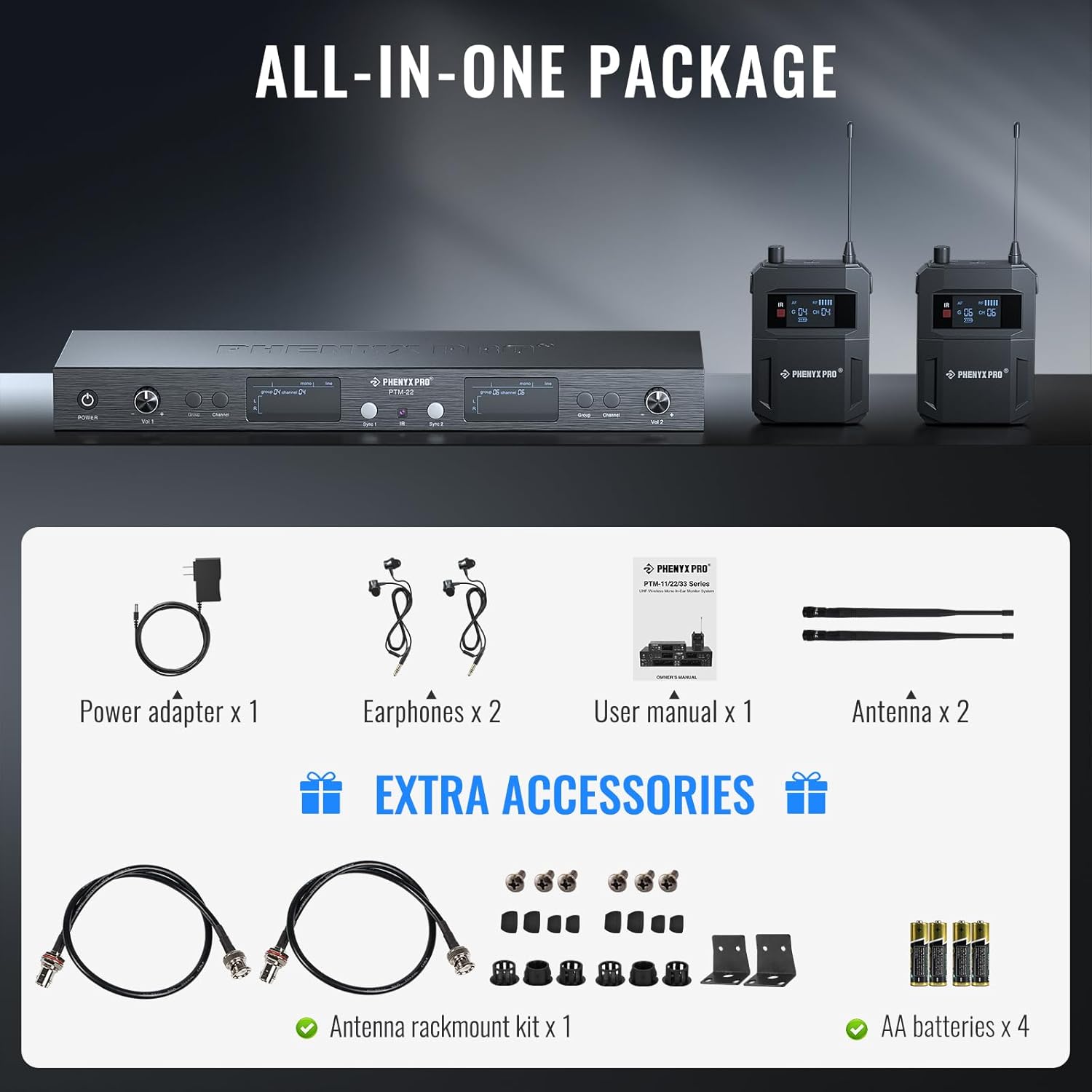- BOX CONTENTS: 1 x Dual Channel Wireless IEM Transmitter, 2 x UHF Bodypack Receiver, 2 x Earphone, 1 x Power Adapter, 2 x Antenna, 4 x AA Battery, 1 x Rackmount Kit, 1 x Carry Case, 1 x User Manual - M22-2B