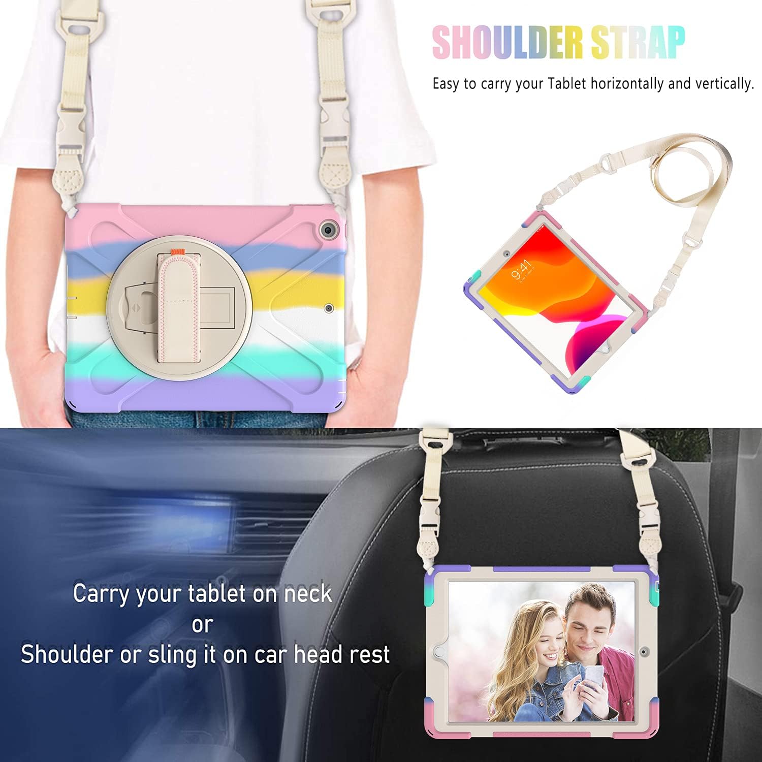 - Removable Shoulder Strap: Attach the strap to any two corner holes of this iPad 10.2 Case and it will allow you to display your iPad behind car head rest for easy personal viewing or between two seats for shared viewing. It is also a unique design for kids walking/travelling, architecture designers, real estate agents, construction workers as well as outdoor labor