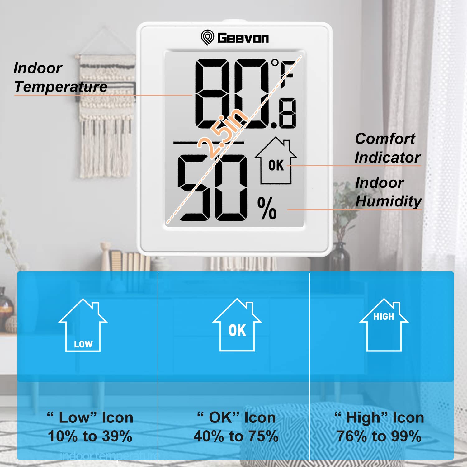 - 【Air Comfort Indicator】Digital hygrometer on the inside with moisture symbol that shows the environmental status - Low / OK / High. Geevon temperature gauge measures indoor humidity and temperature protect you and whole family get rid of troubles caused by excessive dryness or humidity. Maintaining proper temperature and humidity levels inside your home.