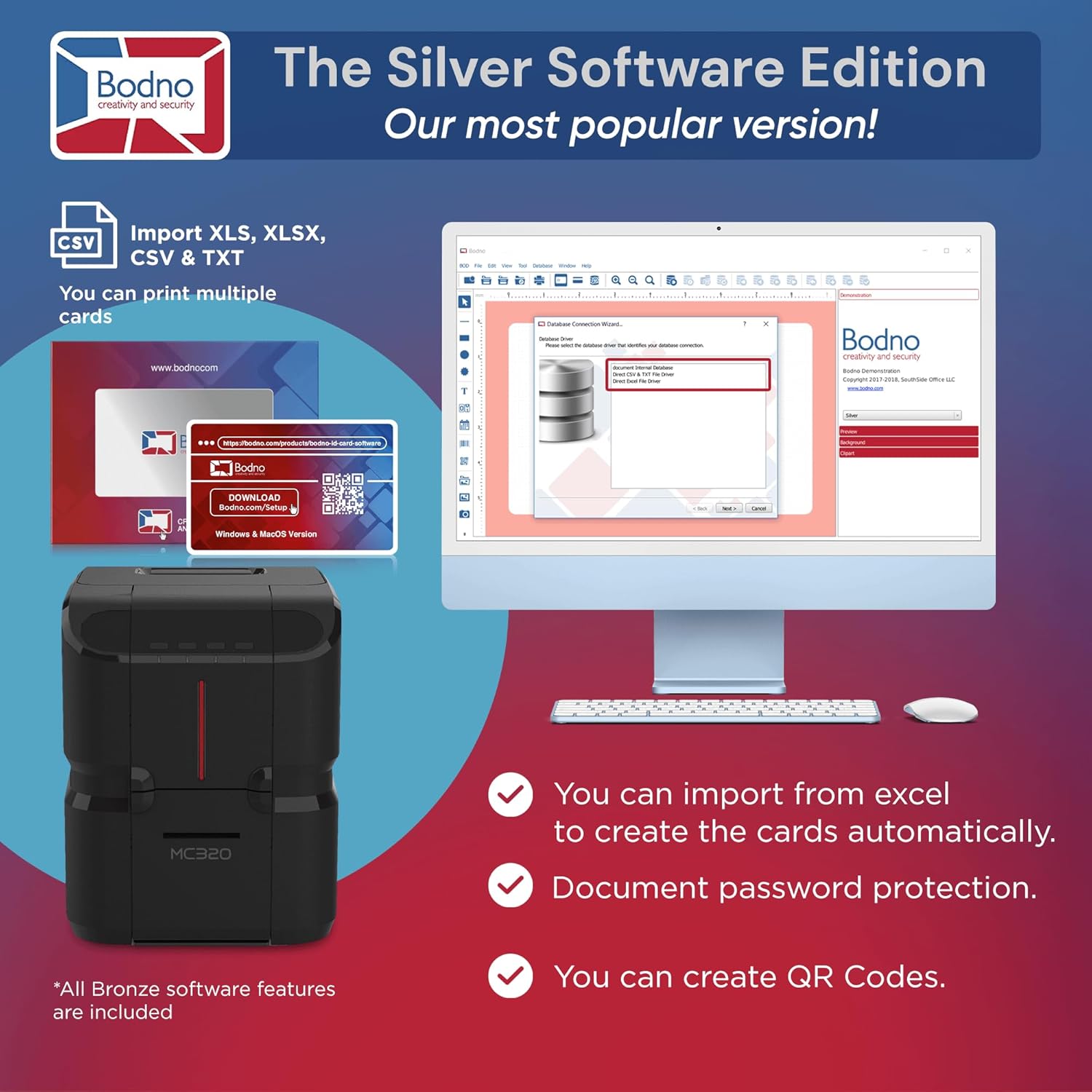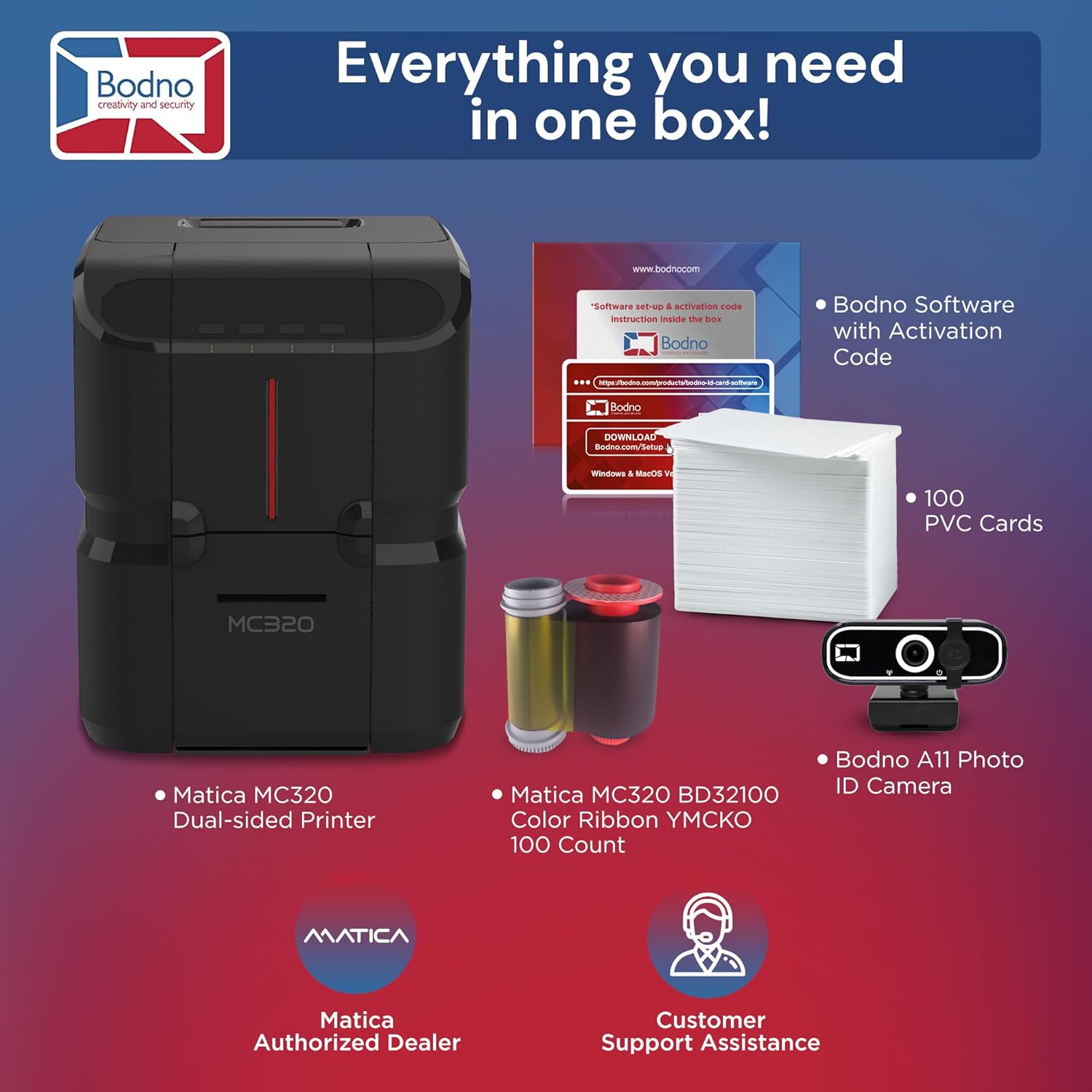 - COMPLETE PACKAGE includes everything you need to start printing – Matica MC320 dual-sided printer, chromXpert YMCKO MC320 Color Ribbon (BD32100 - 100 prints), 100 high-quality, durable white PVC cards, an A10 ID camera to take pictures sent directly to the printer, and Bodno Software (5 editions available - Bronze, Silver, Gold, Diamond, and Platinum). SILVER edition includes all Bronze edition features plus auto-create with import from Excel or CSV.