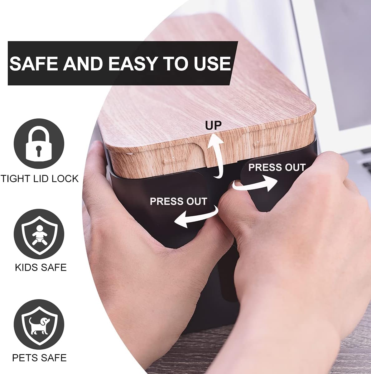 - [STYLISH MEETS PRACTICALITY] With a stylish black finish and simulated wood grain style lid fine design, it will blend neatly with any decor and look stunning. Simply place surge protectors and cords cables inside and close the lid, quick and easy use