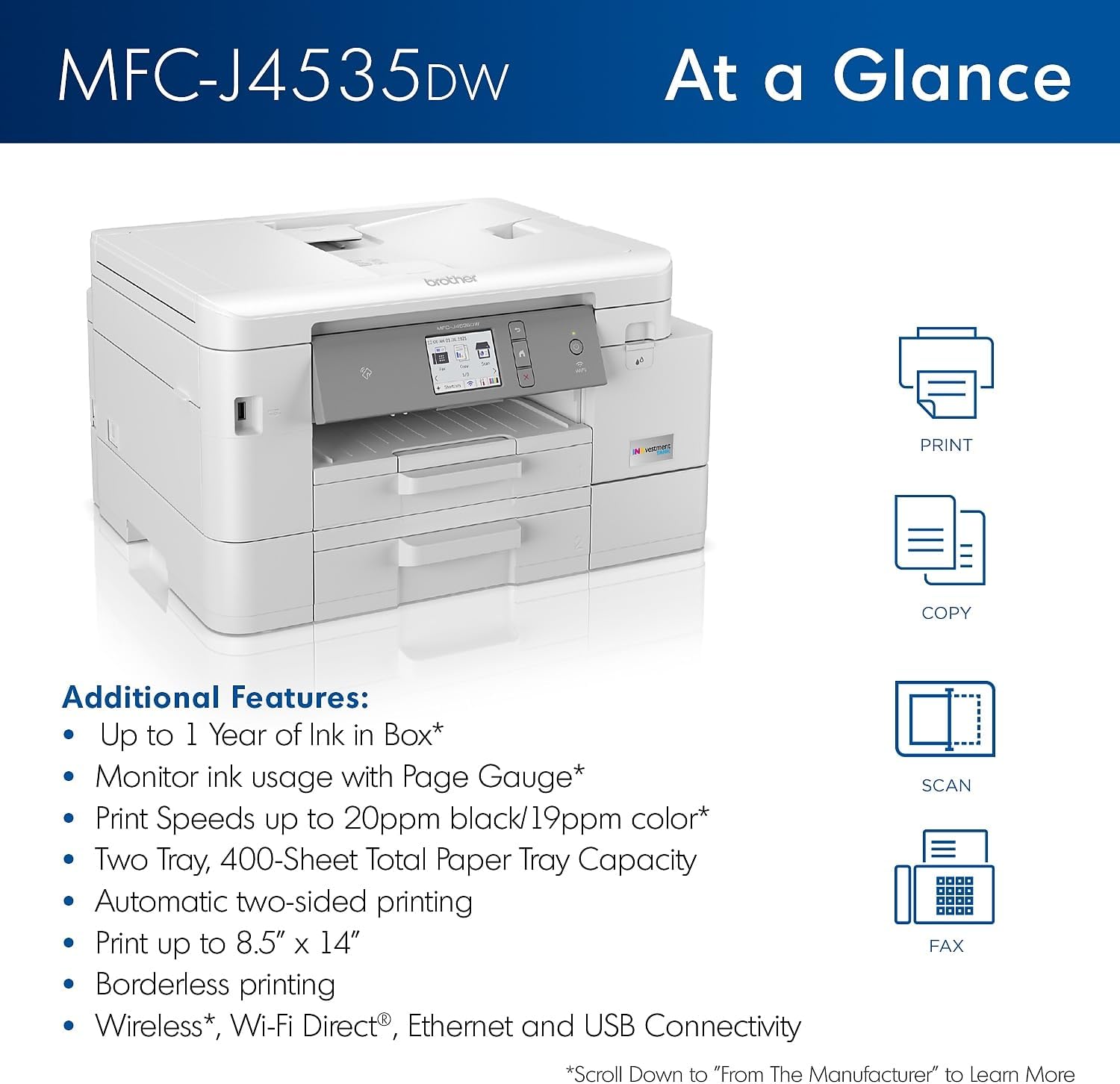 - UP TO 1-YEAR OF INK IN-BOX¹ – Experience uninterrupted printing and significant cost savings with enough ink included for up to 1 year.