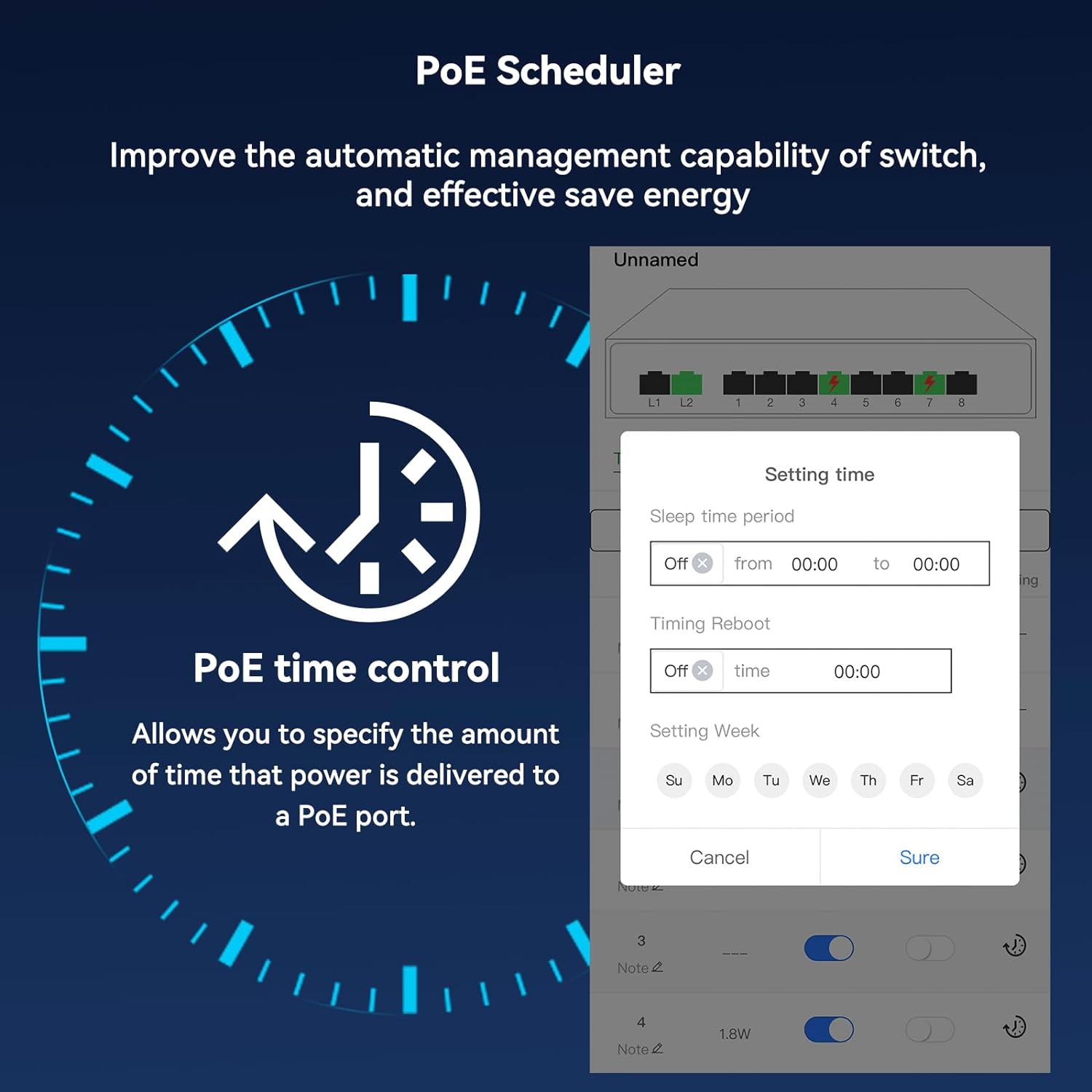 - APP Smart Managed: All ports visibility, and simple cloud management of the whole network at different sites -all controlled from a single interface anywhere, anytime; Alerts for connectivity problems and remote troubleshooting tools when needed. Remote cloud access, feel free to Live check and solve the problems with your family or friends via POE Switch App wherever you are.(Please note: When adding a device for the first time, the switch needs to be connected to the Internet and powered on before the device can be activated.)