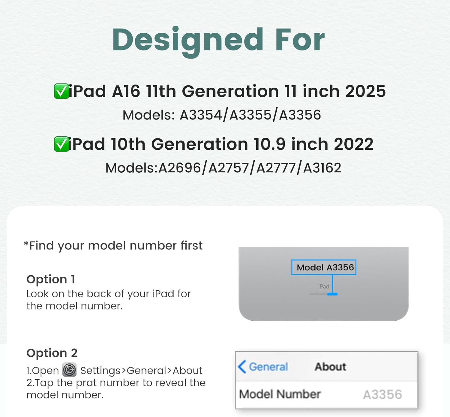 - ✅【Keyboard Case for iPad 11th 10th Generation】❗❗No pen or charger included!❗❗The keyboard Cover is designed for iPad A16 11th Generation 11-inch 2025 (A3354/A3355/A3356) and for iPad 10.9 10th Gen 2022 (A2757/A2777/A2696).♐It's Not compatible with any other devices. Please check the model number back bottom of your iPad.