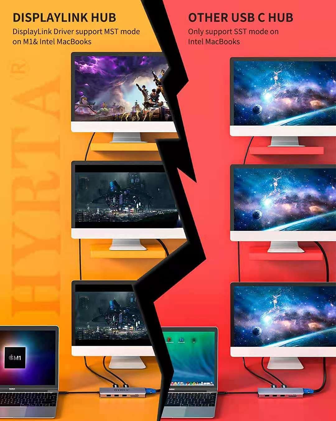 - Compatible for M1/M2/M3 MacBook :HYRTA laptop docking station has more powerful and stable with the ports of connectivity, supports triple Monitors for MacOS and Windows, and dual monitor non-mirror expended. You can expand your laptop's desktop to dual or triple displays at once to increase work and study productivity, make you start a more intelligent life.