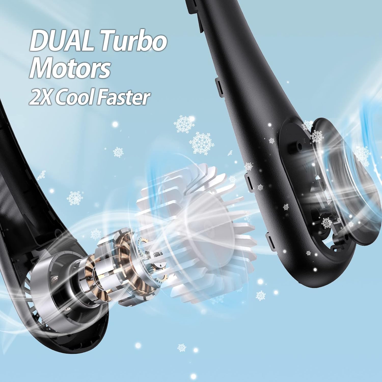 - Bladeless and Cool: instead of traditional fan blades, our leafless neck fan adopts 2 turbo motors to transfer cooling and fresh air from 60 dedicated air outlets to drive away heat from your neck to your cheek and face. No more worry about hair/beard getting caught; just slip it on your neck and enjoy the cool breeze while looks cool