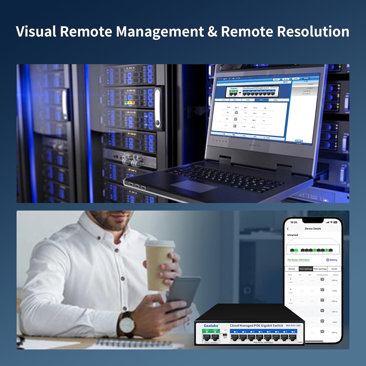 - Easy managed poe switch with 802.3af/at compliant: Goalake 10 port gigabit poe switch seamlessly support both PoE and non-PoE devices. When connecting a passive PoE device or a non-PoE device, the switch efficiently transmits data without providing power, ensuring the connected device is separately powered. Alternatively, you can pair it with an active PoE splitter for added versatility. The switch's intelligent design automatically detects connected devices, ensuring only PoE devices receive power, thus preventing damage to non-PoE devices.
