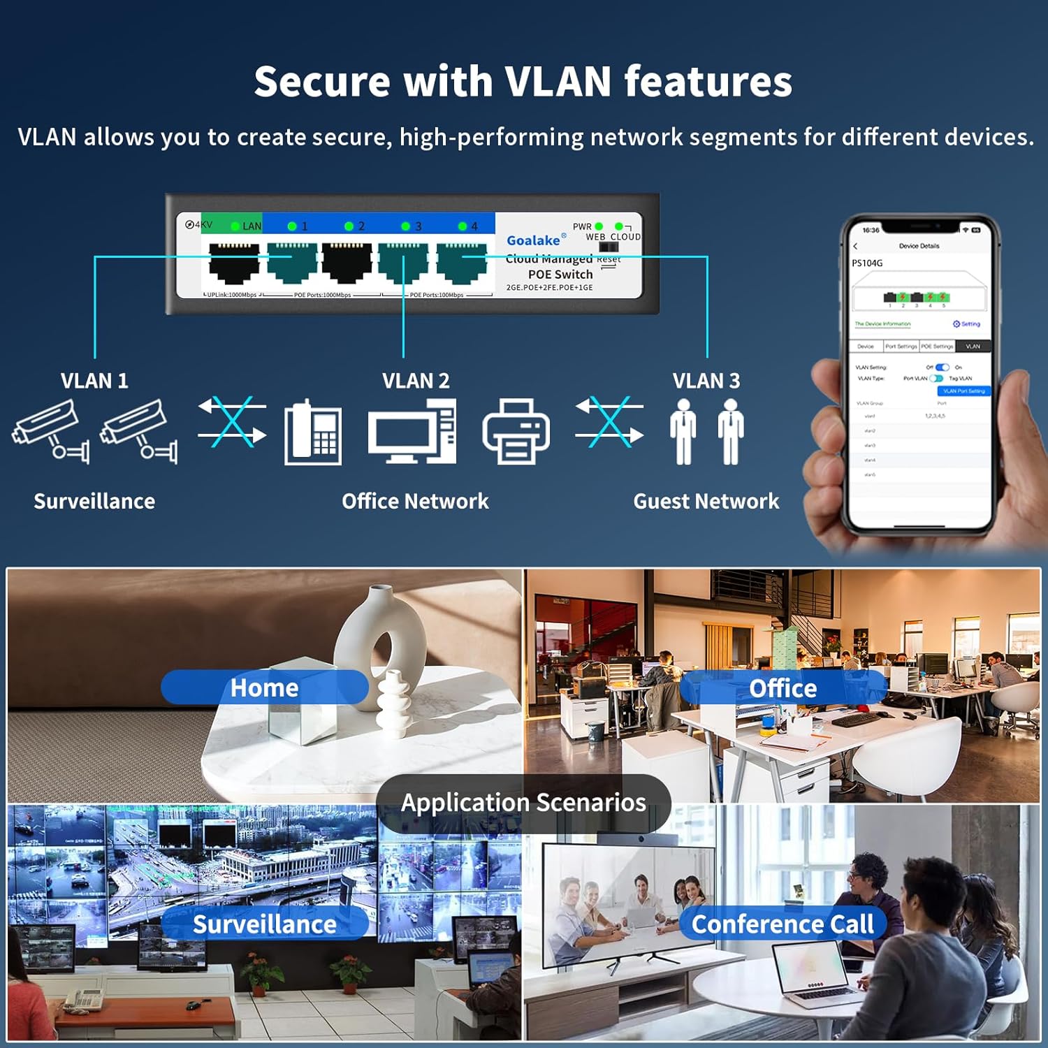- Enhanced Power and Flexibility: Easy Smart Management allows you to manage and configure your network effortlessly via a app or a comprehensive web interface and free software, easily monitor and manage your network from anywhere with the intuitive cloud management interface. Experience the superior power and flexibility of Goalake PoE switches with POE+. Enjoy cost savings and simplified installations with plug-and-play functionality, making it easier to set up IP cameras and wireless access points. You can mount the PoE switch on the wall or desktop, perfect solution for home office and a variety of environments.