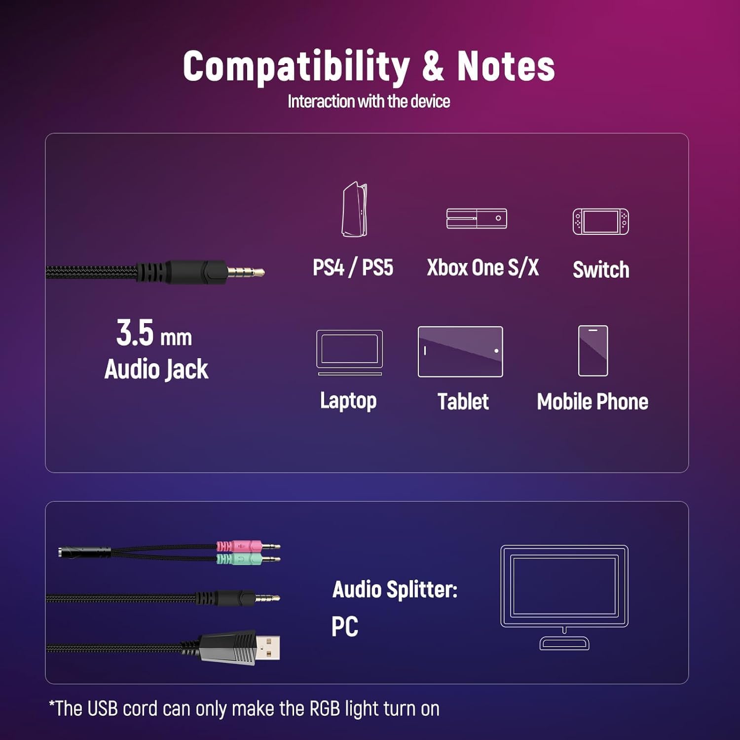 - Multi-Platform Compatibility: Our gaming headphones support perfectly Ps5, Ps4, Xbox Series X/S, PC, Switch, Laptop, Mac via the universal 3.5mm wired connection. (Please note you need an extra Microsoft Adapter (Not Included) when connect with an old version Xbox One controller.