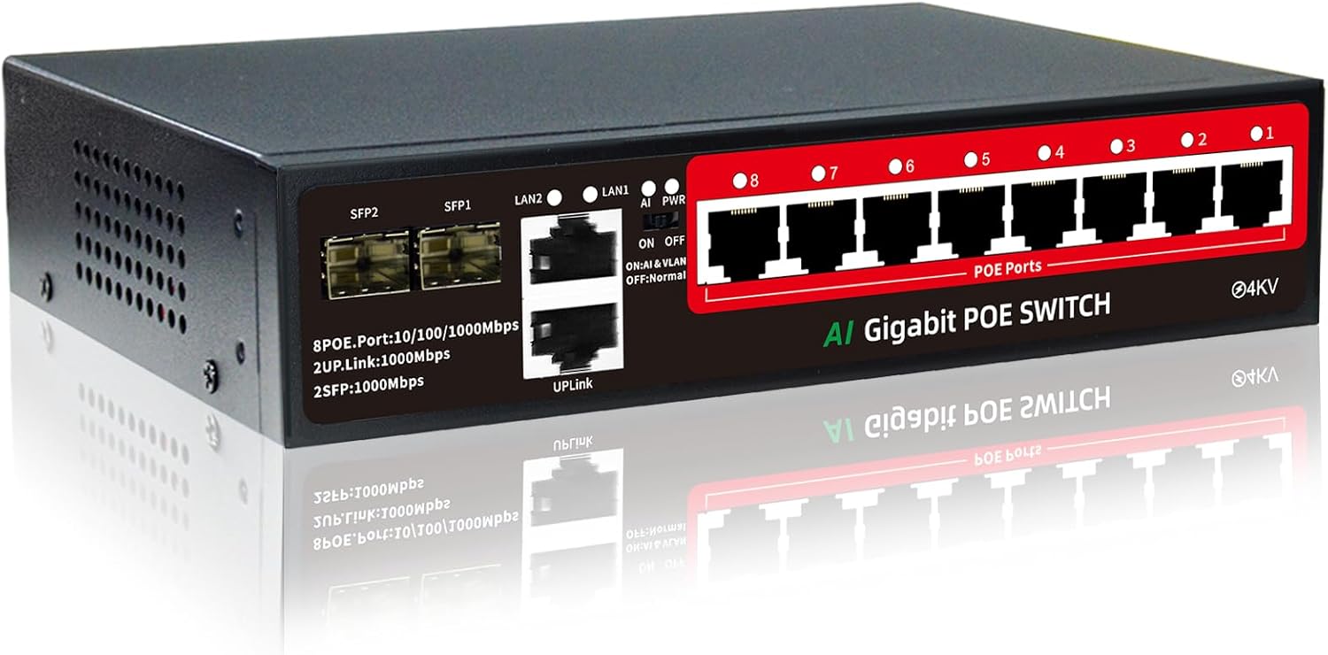 STEAMEMO 8-Port Gigabit PoE Switch | 2×Gigabit Uplinks + 2×1.25G SFP, AI VLAN Mode, 802.3af/at@120W, Unmanaged Metal Plug & Play (Desktop/Wall Mount)