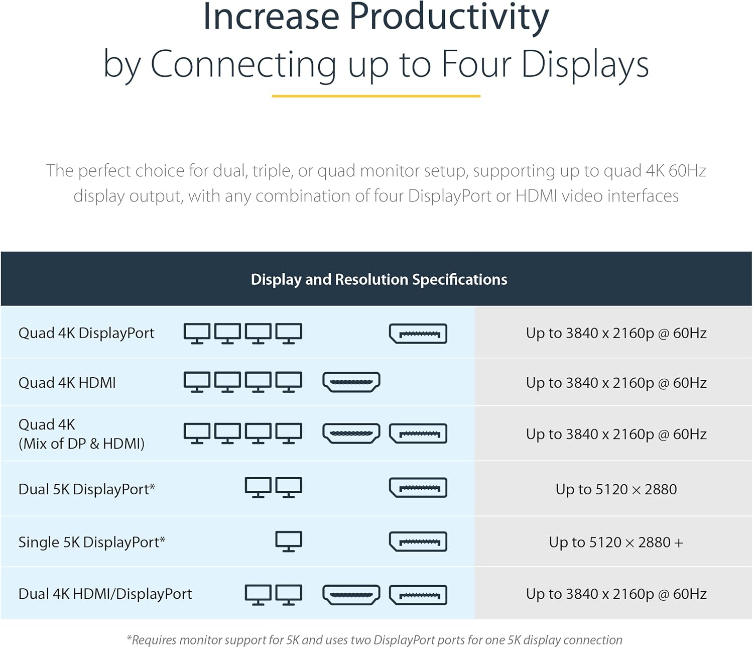 - QUAD MONITOR USB-C DOCK: USB TYPE-C DOCK SUPPORTS UP TO FOUR (4K 60HZ) MONITORS, INCLUDING QUAD, TRIPLE OR DUAL EXTENDED DISPLAYS, USING ANY COMBO OF 4X DISPLAYPORT (DP) AND/OR 4X HDMI 2.0 OUTPUTS OR DUAL 5K 60HZ (2X DP PER DISPLAY); 100W POWER DELIVERY QUAD MONITOR USB-C DOCK: USB Type-C dock supports up to four (4K 60Hz) monitors, including quad, triple or dual extended displays, using any combo of 4x DisplayPort (DP) and/or 4x HDMI 2.0 outputs or Dual 5K 60Hz (2x DP per display); 100W Power Delivery
