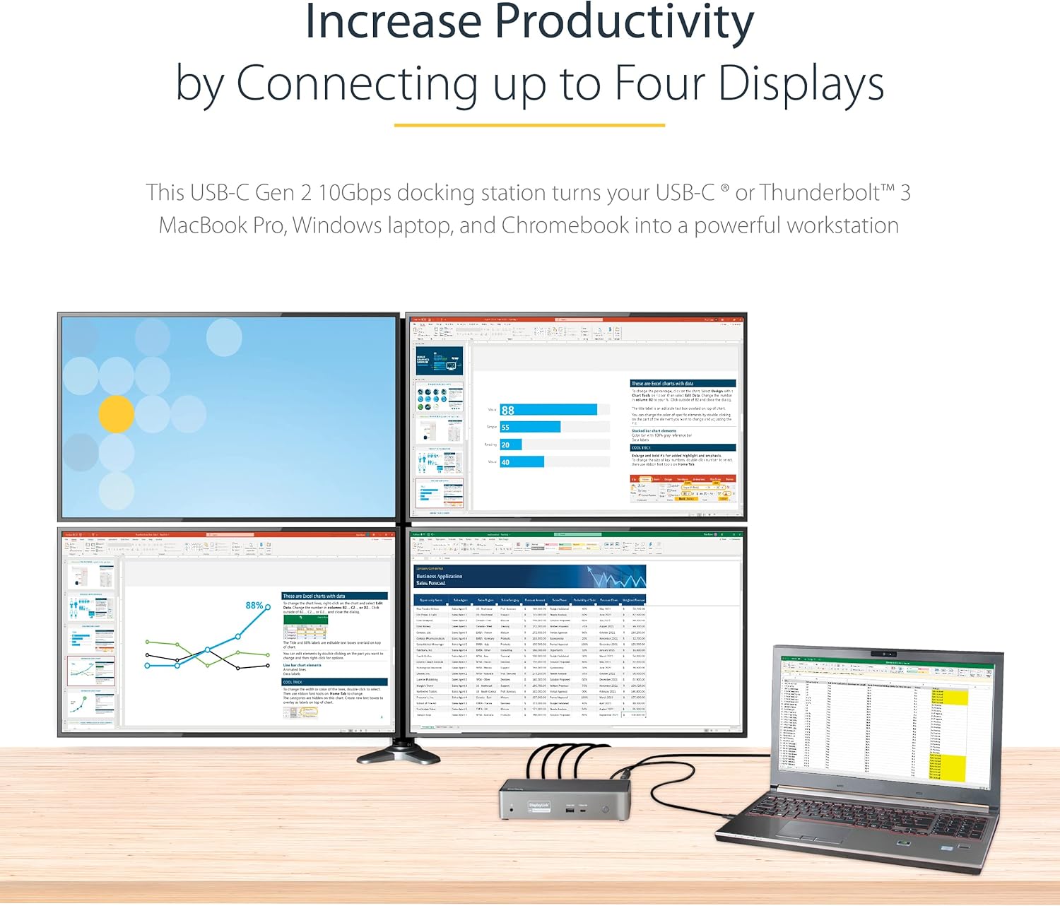 - EASY SETUP & MANAGEMENT: QUADRUPLE DISPLAY DOCKING STATION WITH 3.3FT (1M) USB-C HOST CABLE (USB-IF CERTIFIED), FRONT ON/OFF BUTTON, K-SLOT & MOUNTING HOLES, ; OPTIMIZED VENTILATION FOR ENHANCED COOLING EASY SETUP & MANAGEMENT: Quadruple display docking station with 3.3ft (1m) USB-C host cable (USB-IF certified), front On/Off button, K-slot & mounting holes, ; optimized ventilation for enhanced cooling