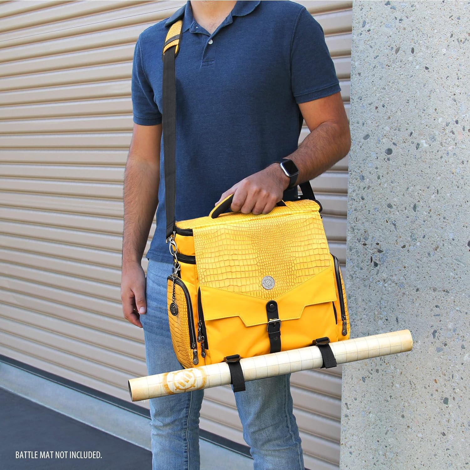 ENHANCE Collector's Edition RPG Adventurer's DnD Bag - Dragon Hide Exterior Travel RPG Bag with Tabletop Miniatures Storage Vault, Mat Holder, DnD Dice & Token Pockets, Fits 4-8 Books (Dragon Gold)