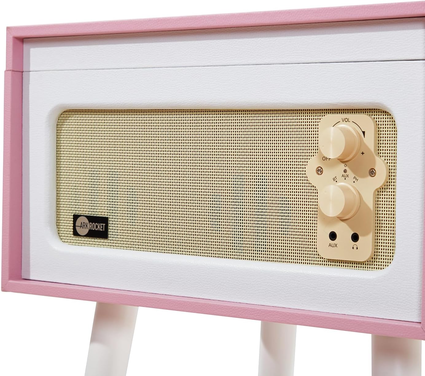 Arkrocket Discovery II 3-Speed Bluetooth Record Player Retro Console Turntable with Built-in Speakers and Removable Legs (Pink/White)