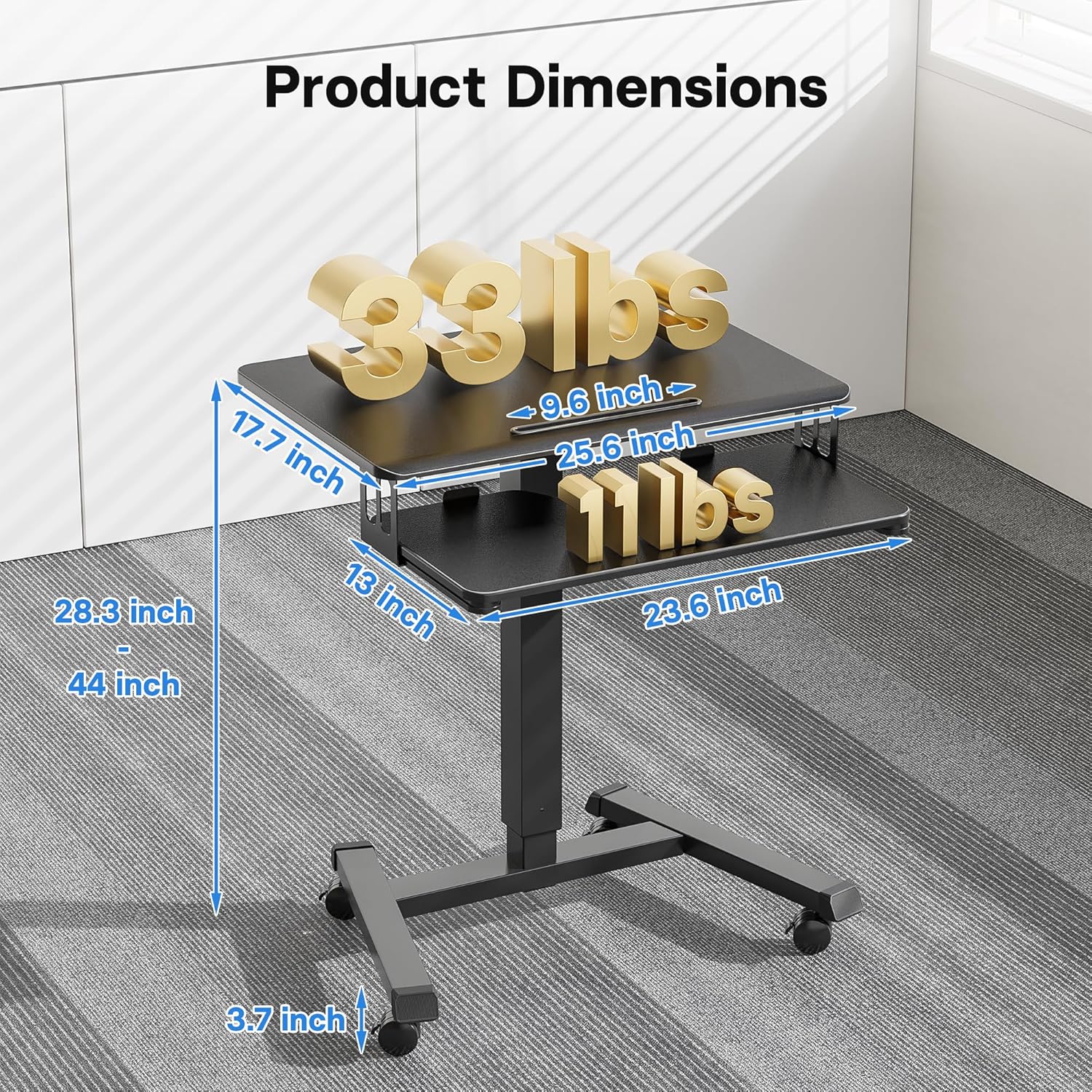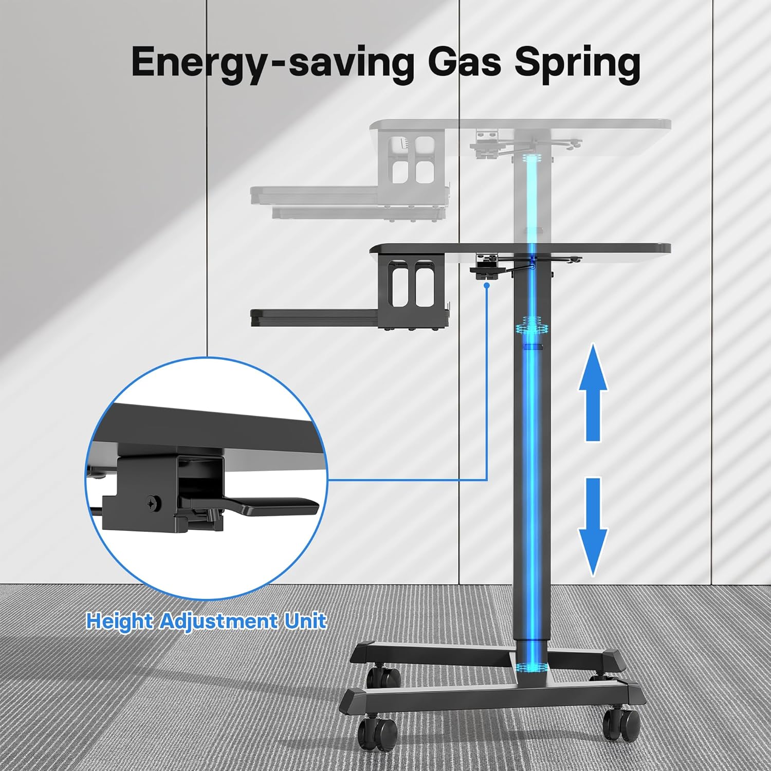 - ADJUSTABLE HEIGHT DESIGN: The mobile standing desk promotes a healthier workstyle by allowing quick transitions between sitting and standing. The gas spring lift smoothly adjusts the height from 28.3in to 44in, supporting better posture and reducing neck and back strain during long working hours. This portable desk improves daily comfort and productivity across different environments.