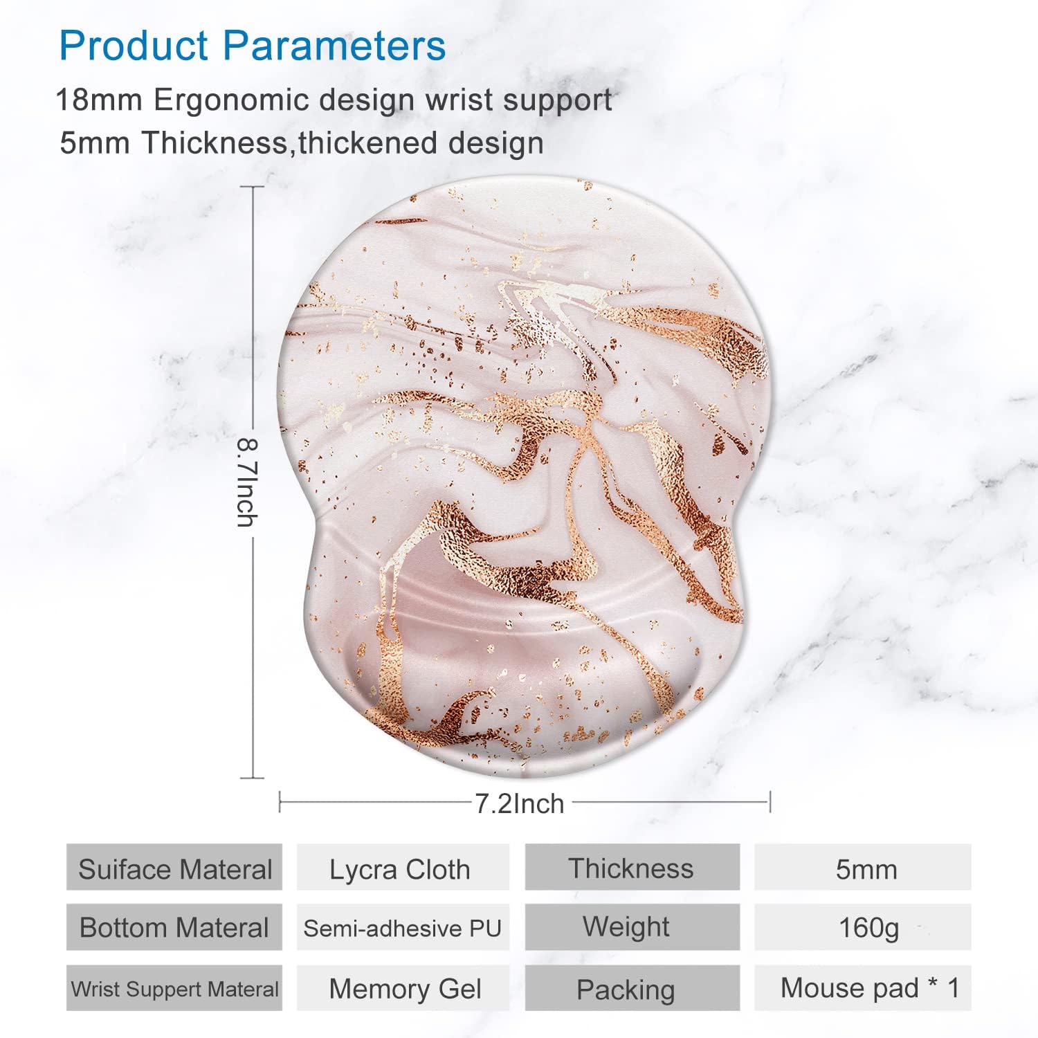 ITNRSIIET Ergonomic Mouse Pad with Gel Wrist Support Small Wrist Rest Smooth Surface Non-Slip PU Base Comfortable Office Supplies Pain Relief, 8.7 x 7.2 inches, Rose Gold Marbling