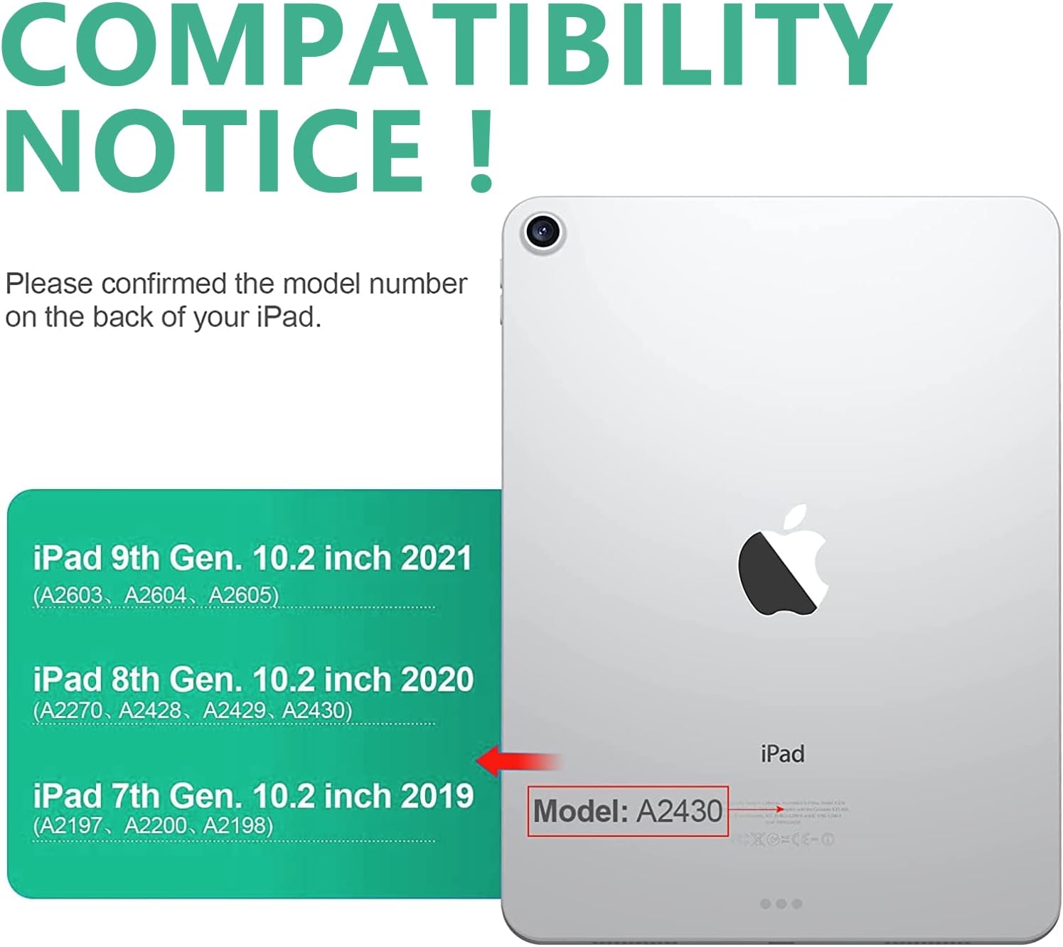 - Case with Keyboard foriPad 10.2 :The keyboard case is compatible with new iPad 10.2 9th Gen 2021 (Model Number: A2603, A2604, A2605)/8th Gen 2020 (Model Number: A2270, A2428, A2429)/7th Gen 2019 (Model Number: A2197, A2200, A2198). Please check your iPad model before purchasing. Our keyboard case for ipad provides a range of features that enhance both functionality and protection for your iPad