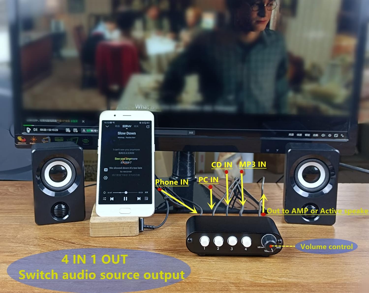 - 4 in 1 out: Support up to 4 audio source inputs and select 1 audio source output