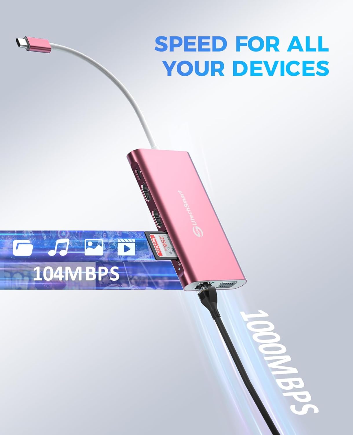 - 【Ultra-portable & Discreet Powerful Workstation】 We designed the USB C hub to be slim and compact without any compromise on accessibility. Lighten your load and ditch the extra cable adapters! The slim portable design of the UtechSmart USB C hub equips with USB C PD port, Gigabit RJ45 port, two 4K capable HDMI ports, VGA port, SD/TF card slot, 2x USB 3. 0 and 2x USB 2. 0 Ports. With a simple plug and play connectivity, This USB C hub turns any USB C capable PC laptop into a mobile workstation!