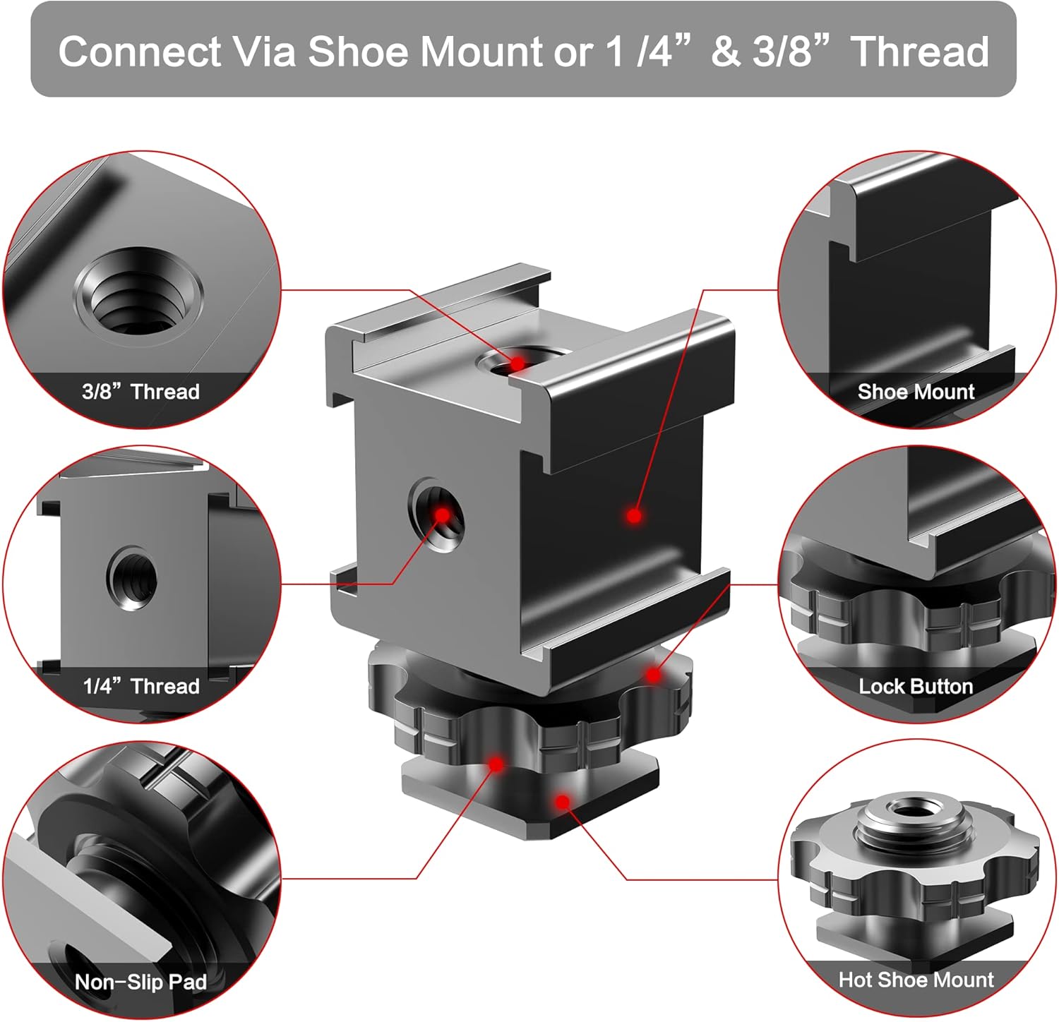 - Universal Studio-Grade Threading:1/4"-20 & 3/8"-16 threads on every cold shoe mount slot connect to: Boom arms Ring lights Phone clamps,Making this cold shoe adapter the ultimate expansion hub for DSLR, mirrorless, or camcorder rigs.