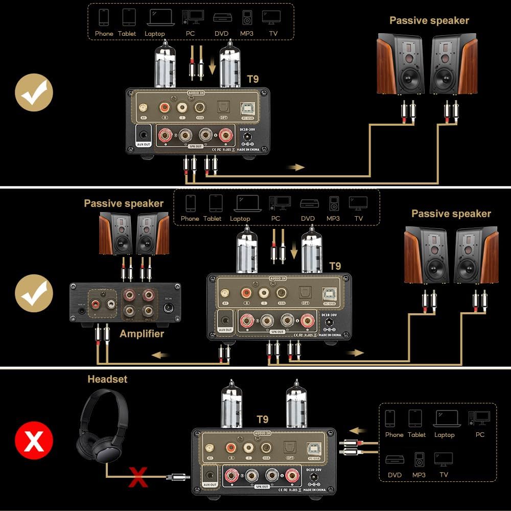 - AIYIMA T9 bluetooth tube amplifier With multiple digital audio inputs: Bluetooth 5.0 / USB / Coaxial / Optical / stereo RCA, compatible with most audio device such as phones, computers, tablets, TVs, TV, CD players etc. The perfect combination of DAC and amplifier, very suitale for audiophiles who have various audio devices
