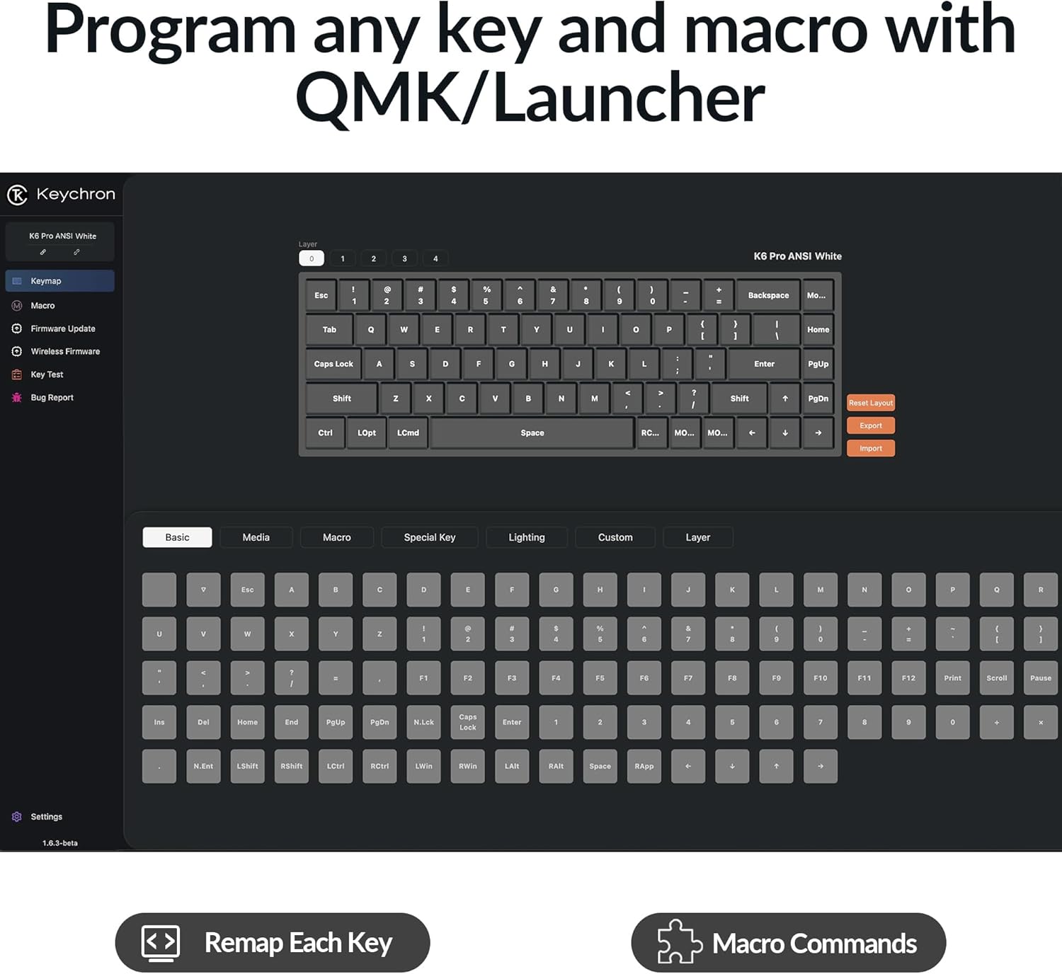 - The Keychron K6 Pro is an innovative custom wireless mechanical keyboard advancing typing experience to a new level. QMK/Launcher allows anyone to customize any key and macro with ease. Together with an upgraded typing sound and feel, and our flexible hot-swppable feature, the K6 Pro is leveraging limitless possibilities with premium typing comfort.
