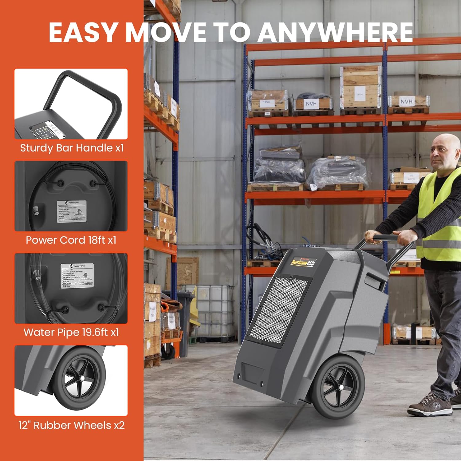 - Durable & Portable: Features a lightweight rotomolded polyethylene shell, big wheels, and handles for easy mobility and long-lasting use. Commercial Dehumidifiers with Pump built to endure rugged conditions with a waterproof and anti-corrosion shell.